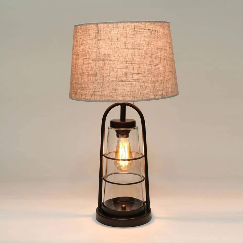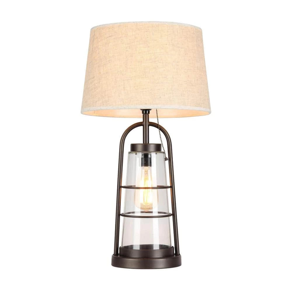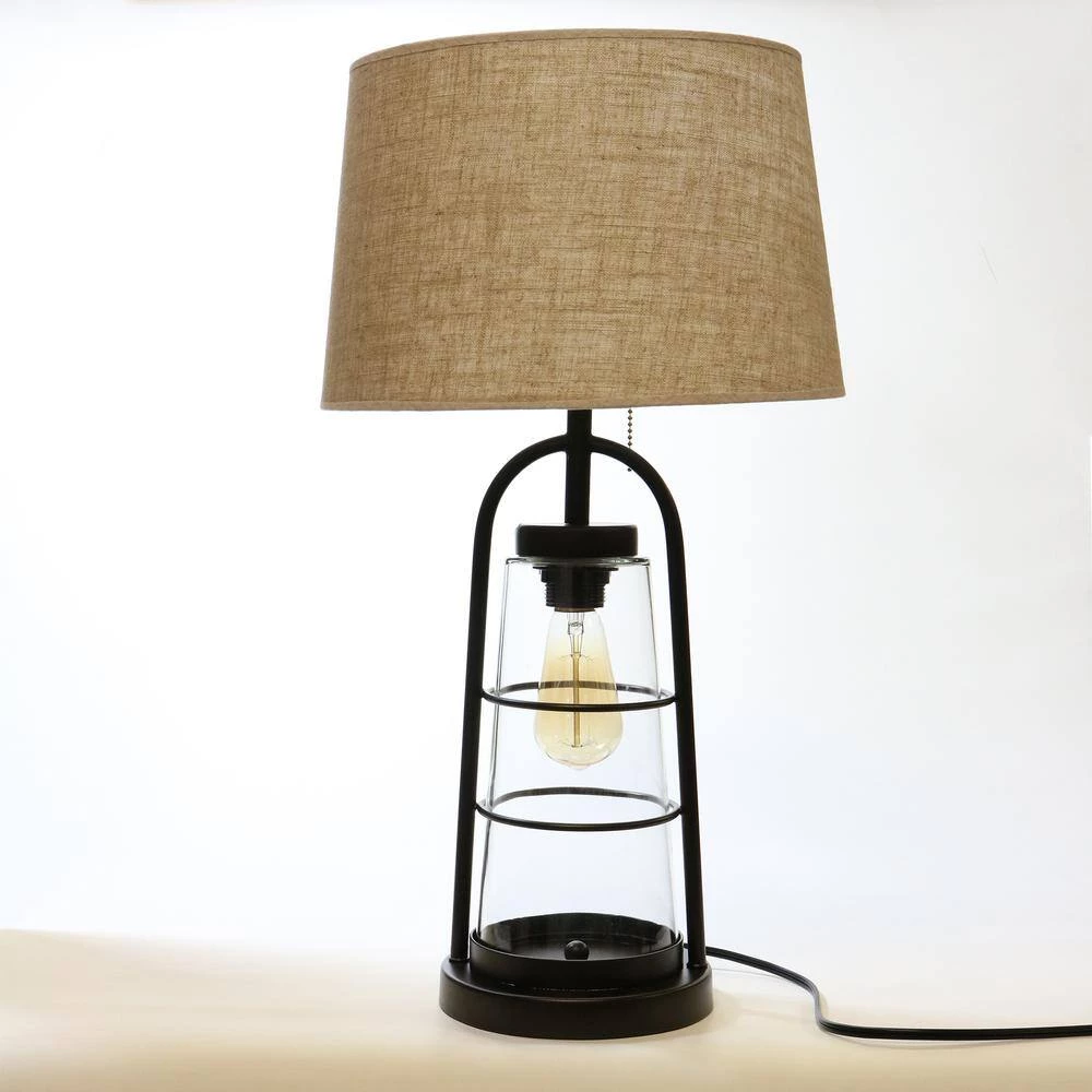 If you are looking for something unique this dual lighted table lamp will be delightfully satisfying. It is a balanced mix of modern lines with industrial forms and traditional elements. Both the fabric shaded lamp and the clear glass base are lighted with Edison style bulbs. The line switch controls power to the base and top lamp. A pull chain allows for separate control of the top lamp giving you a couple alternatives to the lighting style.