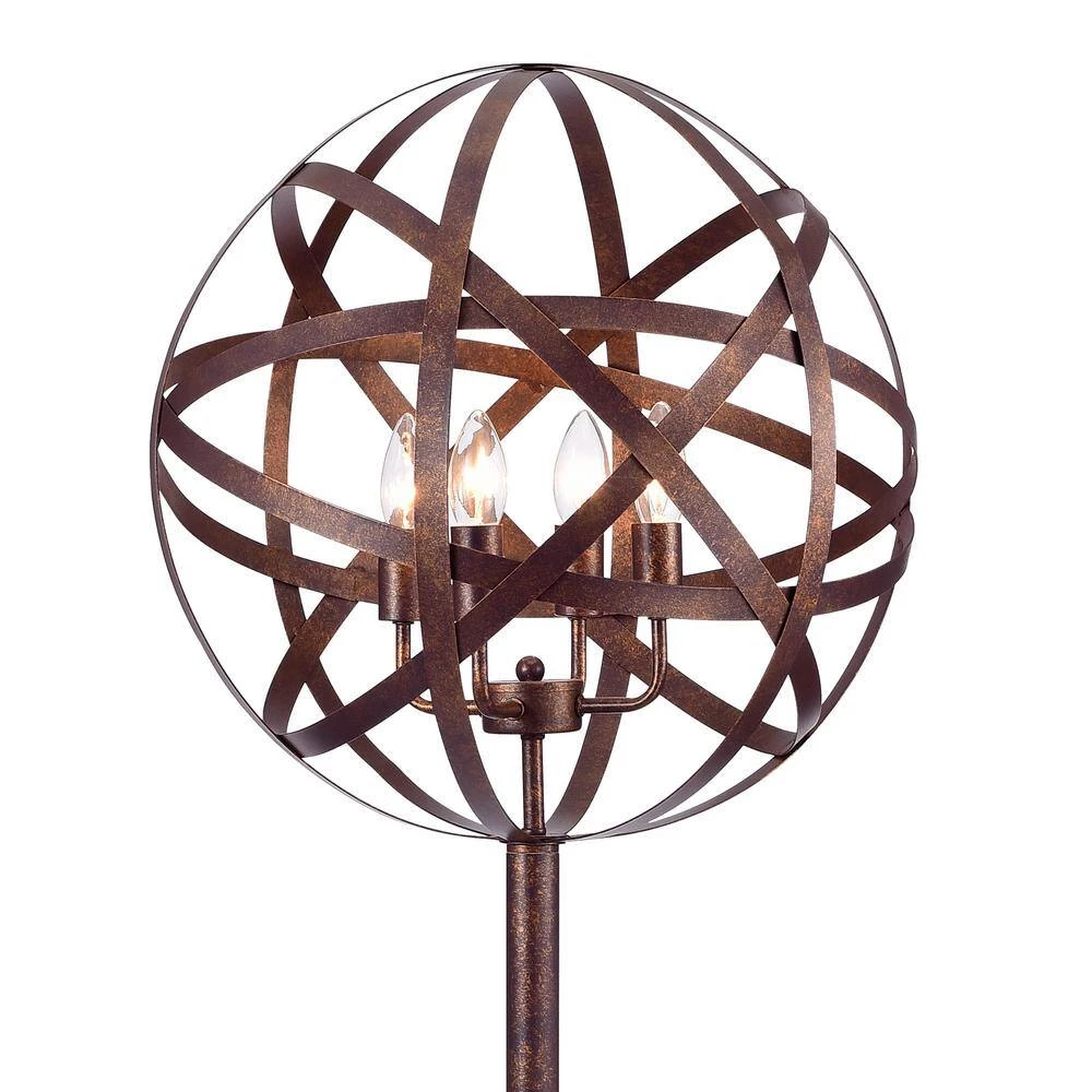 This is an industrial styled full-metal floor lamp in Aged Bronze finish. Gives a strong and sturdy appearance enhanced by the broad strap hoops giving shape to the globe cage shade. The mini-candelabra style single tier lights add a classic charm to the overall piece.