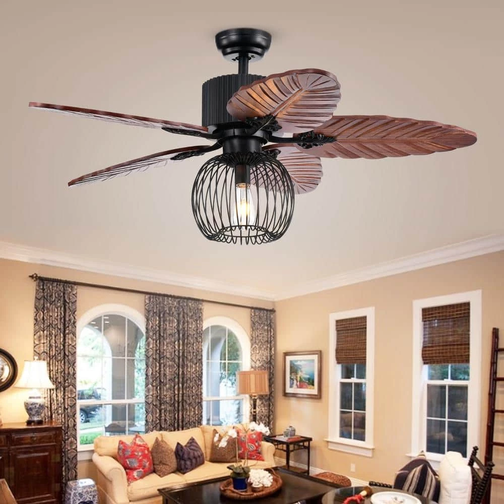 This lighted ceiling fan offers all of the above, along with an edgy whimsical appeal. A strong black finished corrugated design mixed with a wire caged lamp is perfectly suited for today’s modern spaces. The light brown leaf shaped blades are perfect for adding that tropical sensation. The three-speed reversible motor will insure you will find the perfect comfort level.
