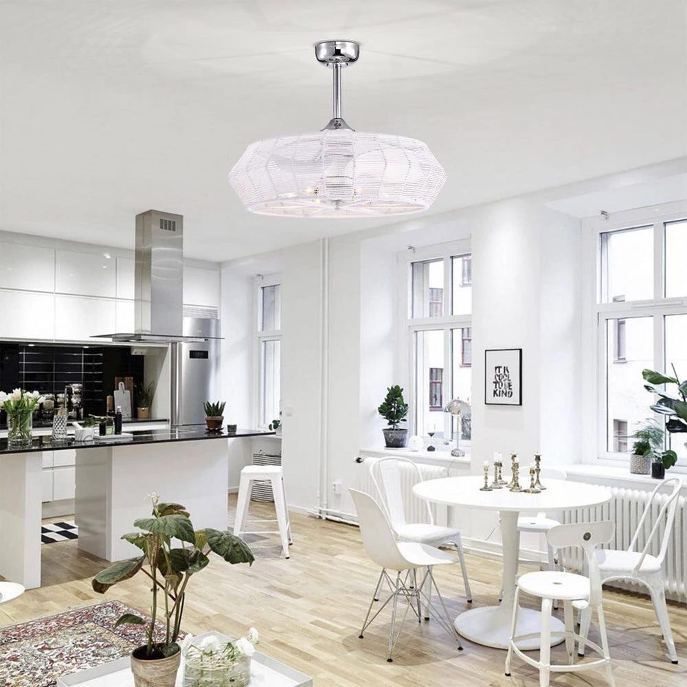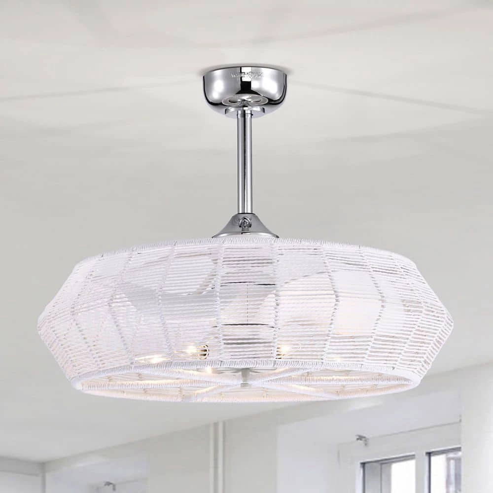 Bring an elegant and natural feel into your home with the help of our 28 in. Chrome and Gloss White Rattan Akasha Ceiling Fan Chandelier. Our fixture features six (6) lights, a Gloss White woven rattan shade, and six (6) different fan speeds that’s bound to find your right level of cooling comfort. Decorative during the day and decoratively functional at night, get the best of both worlds with our 28 in. Akasha Ceiling Fan Chandelier.