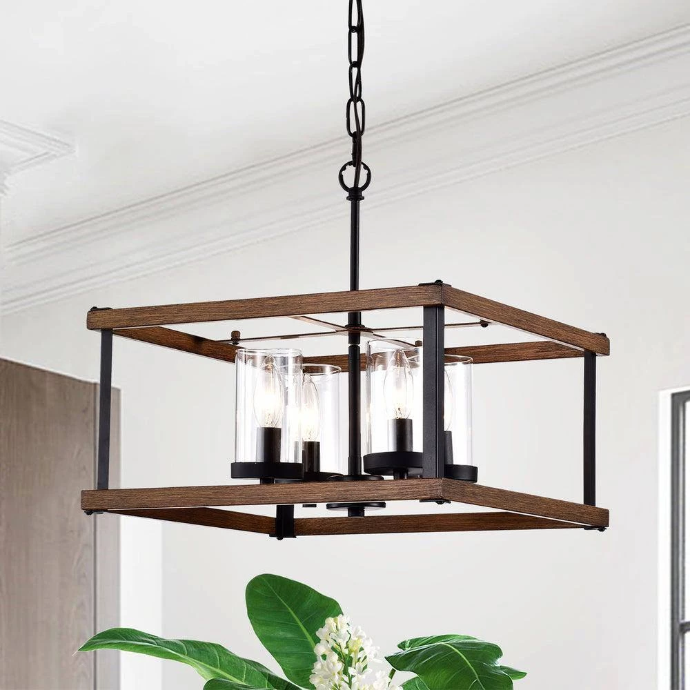 This 4-light chandelier is perfect for a subtle upgrade in your home. The fixture features 4-lights housed inside clear seeded shades. The frame has both a matte black and imitation wood finish giving this fixture a rustic yet modern look.