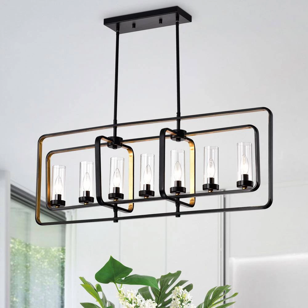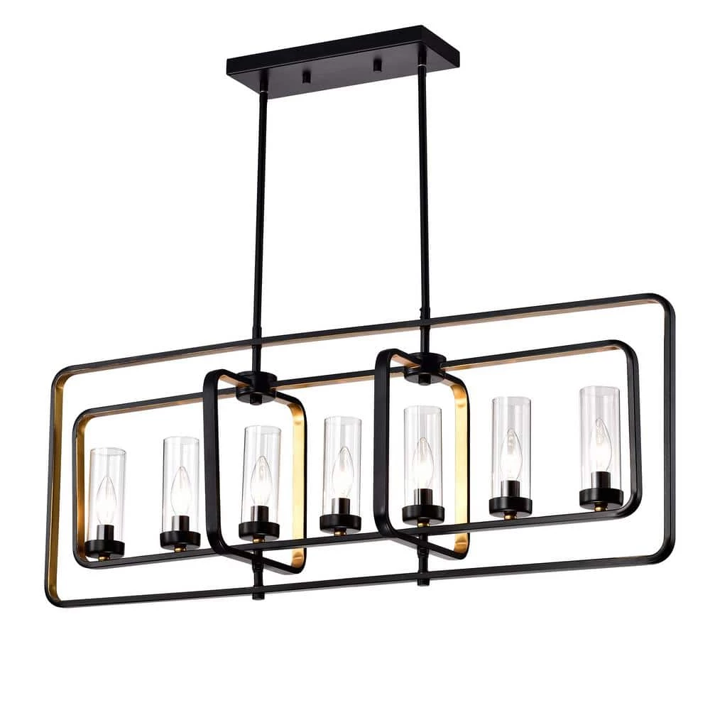 Make an impression with this stunning modern chandelier. It is a single tier seven (7) light linear fixture with rounded edge black and gold geometric configurations. Clear glass pillar shades protect each lamp.