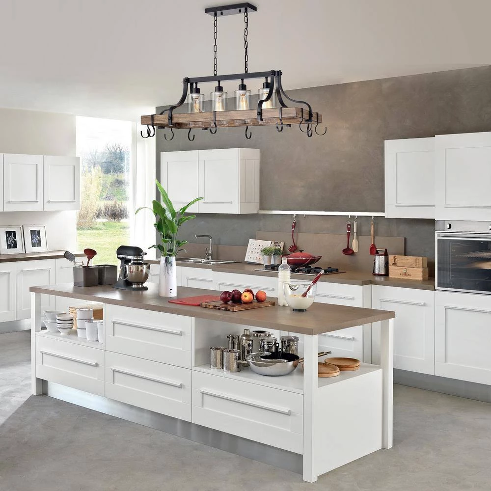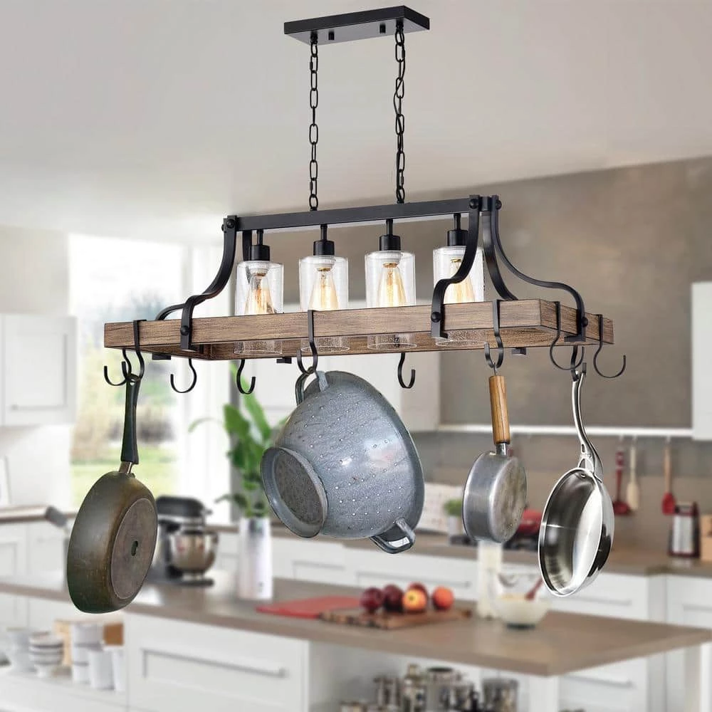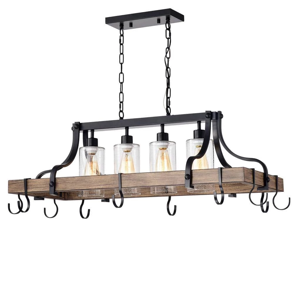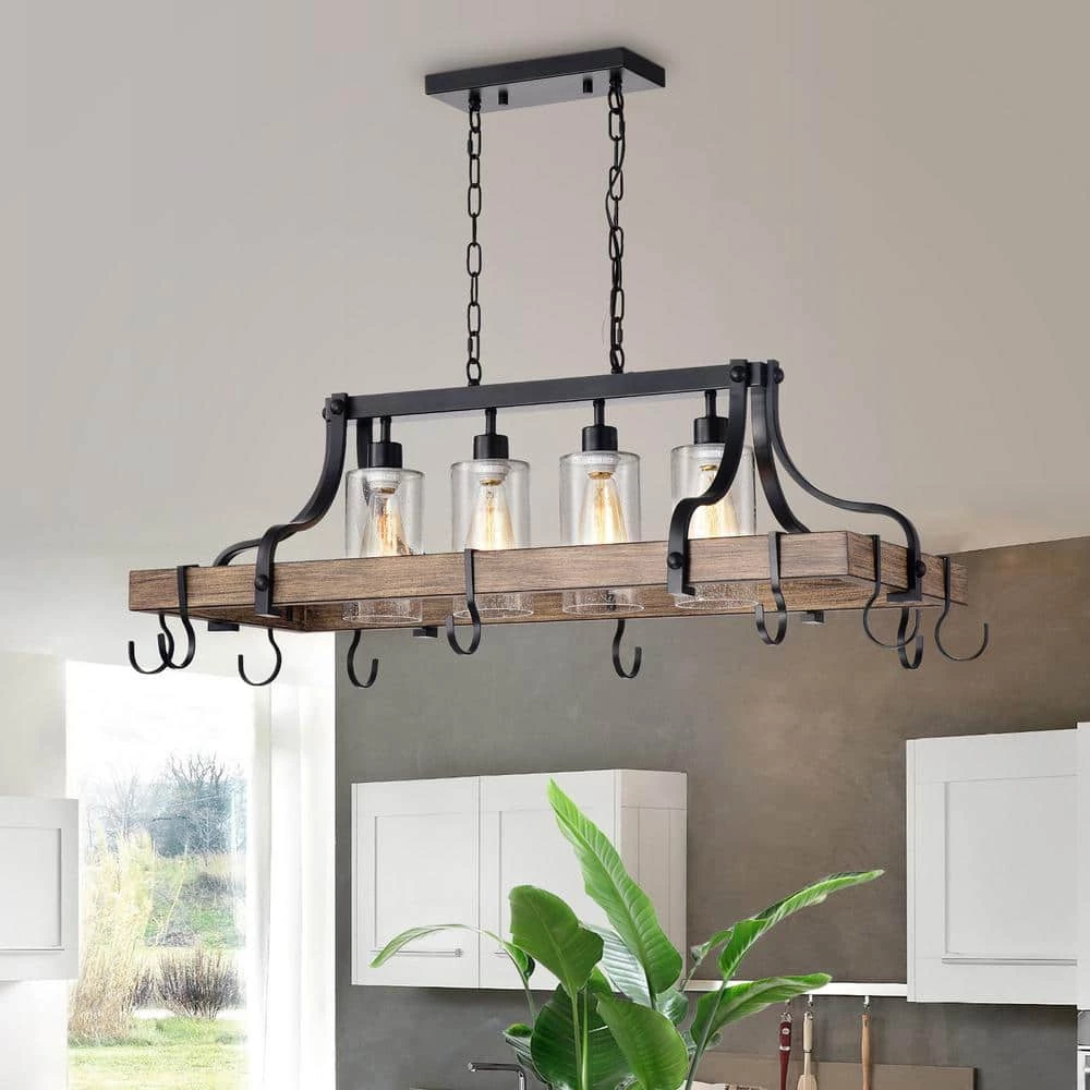 The Blakes 4-light Chandelier is a height adjustable kitchen island light fixture. A classic robust look with black finished iron structuring and a faux-wood grain rectangle frame. Made entirely of metal and glass for easy disinfection to keep your food prep area hygienic. 4-lights insure you get plenty of illumination. Includes Edison Bulbs.