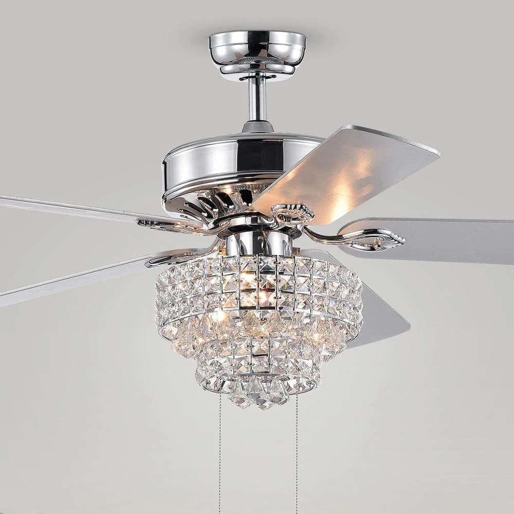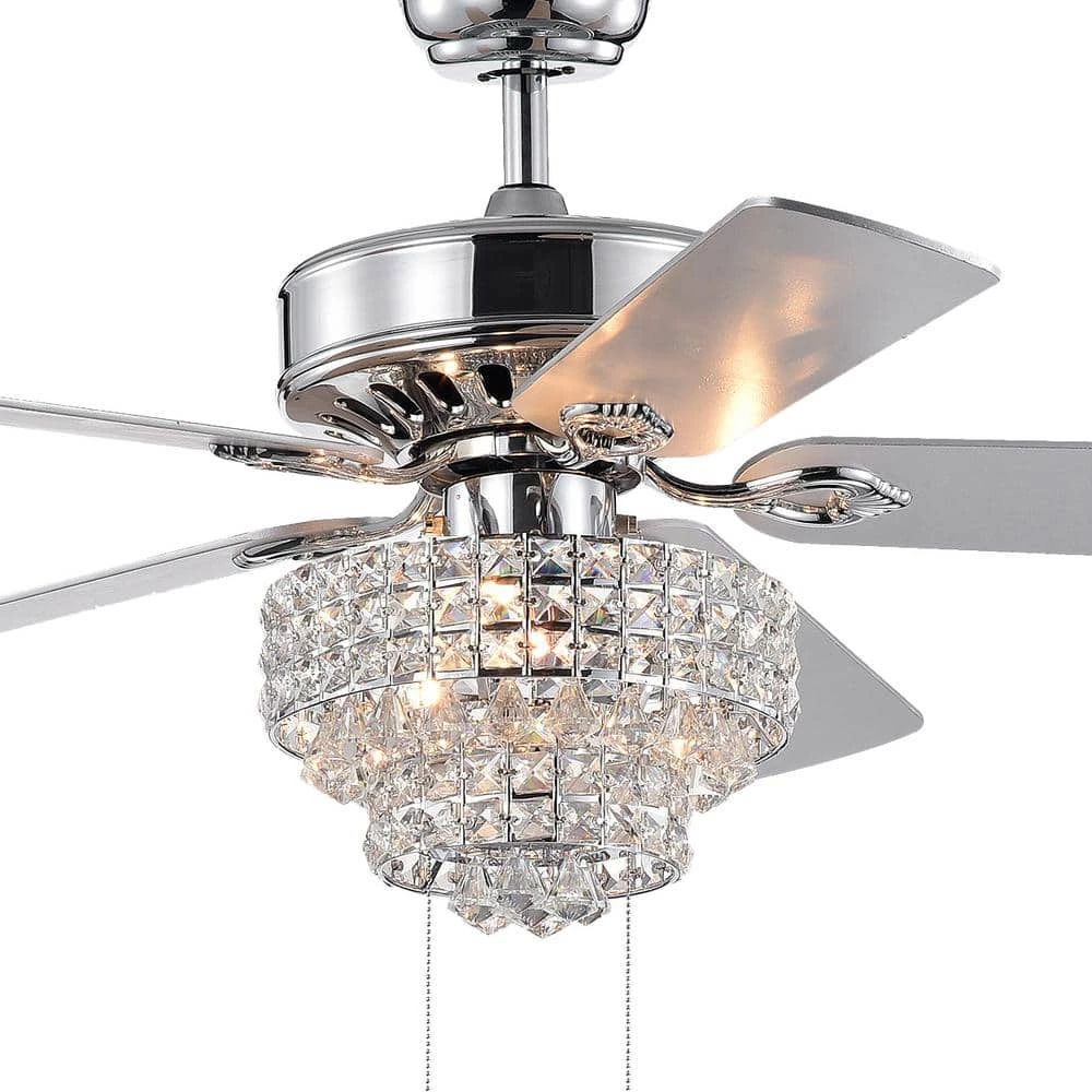 Housed in a brilliant chrome finish and paired with a lovely crystal shade basket, this remote-controlled ceiling fan comes complete with its own elegant chandelier. Introduce a breath of fresh air with our 52-inch Bryanya Chrome Lighted Ceiling Fan. Control the level of comfort at the palm of your hands with the included remote control.
