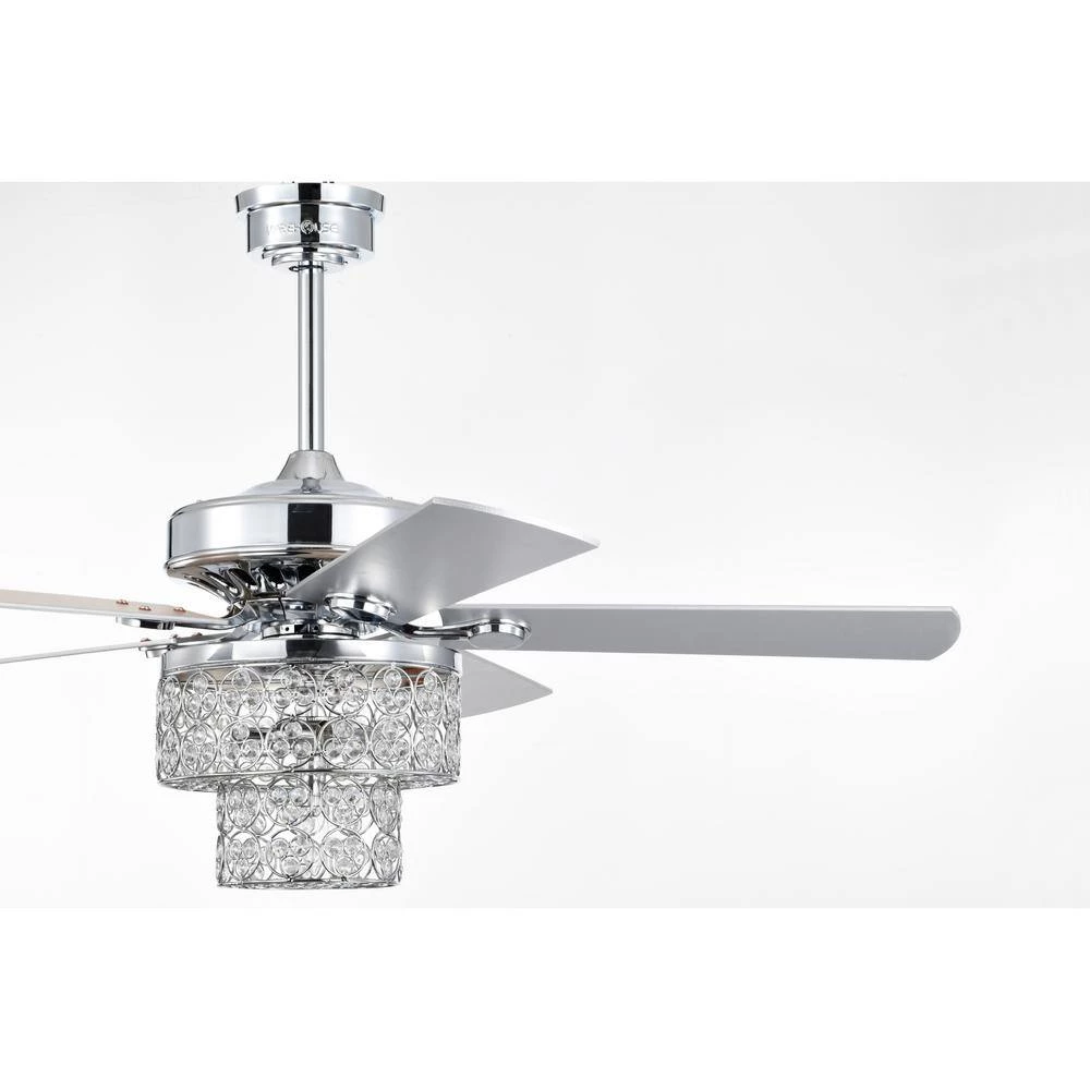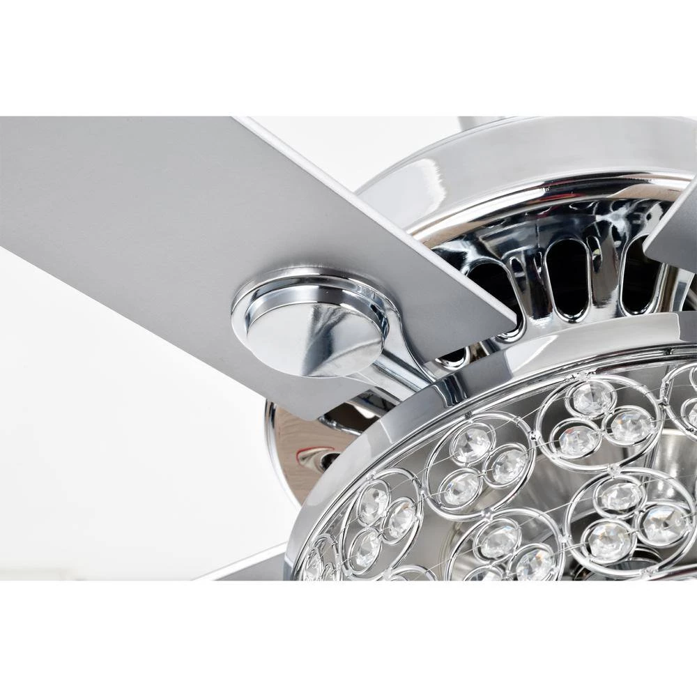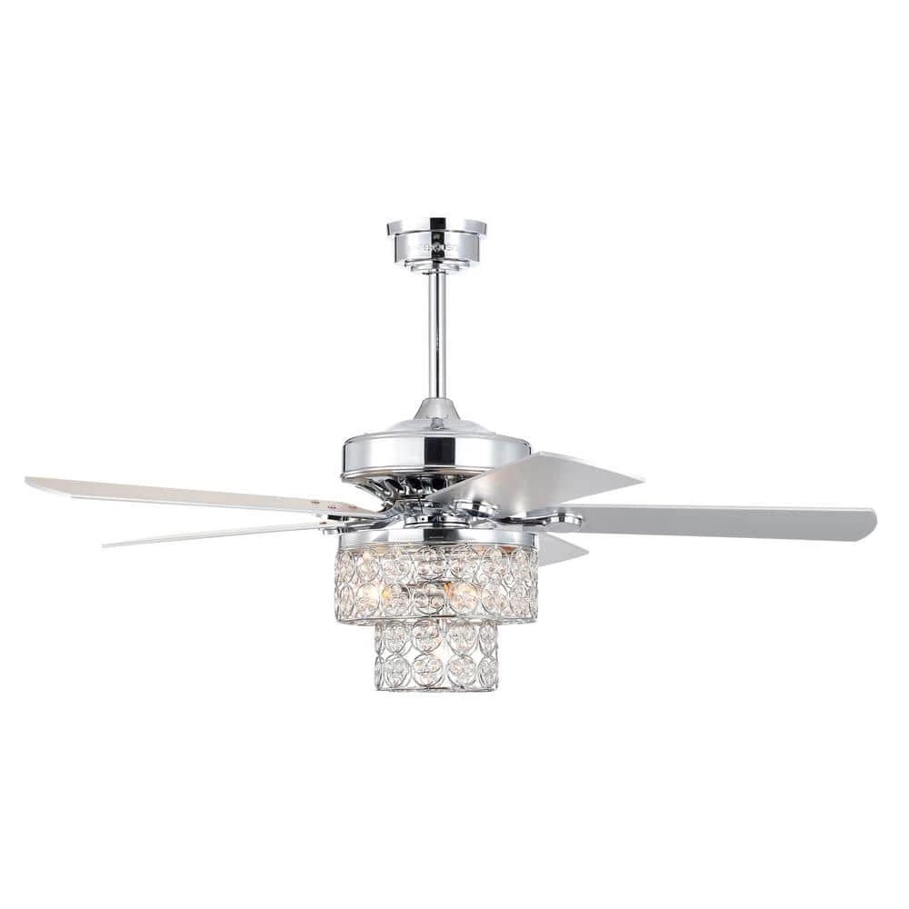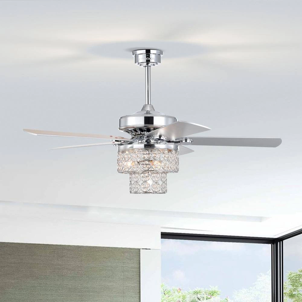 Introduce new lighting, enrichment and air-movement into your living space with our 52 in. Caderina Chrome Ceiling Fan Chandelier, our fixture includes a 2-tiered bottom-only chandelier made up of crystals that are decorative during the day and night, with 4-lights and 3 airing options to choose from, you’re bound to find the right level of cooling comfort. So what are you waiting for. Turn your home into a dream come true with our 52 in. Caderina Ceiling Fan Chandelier.