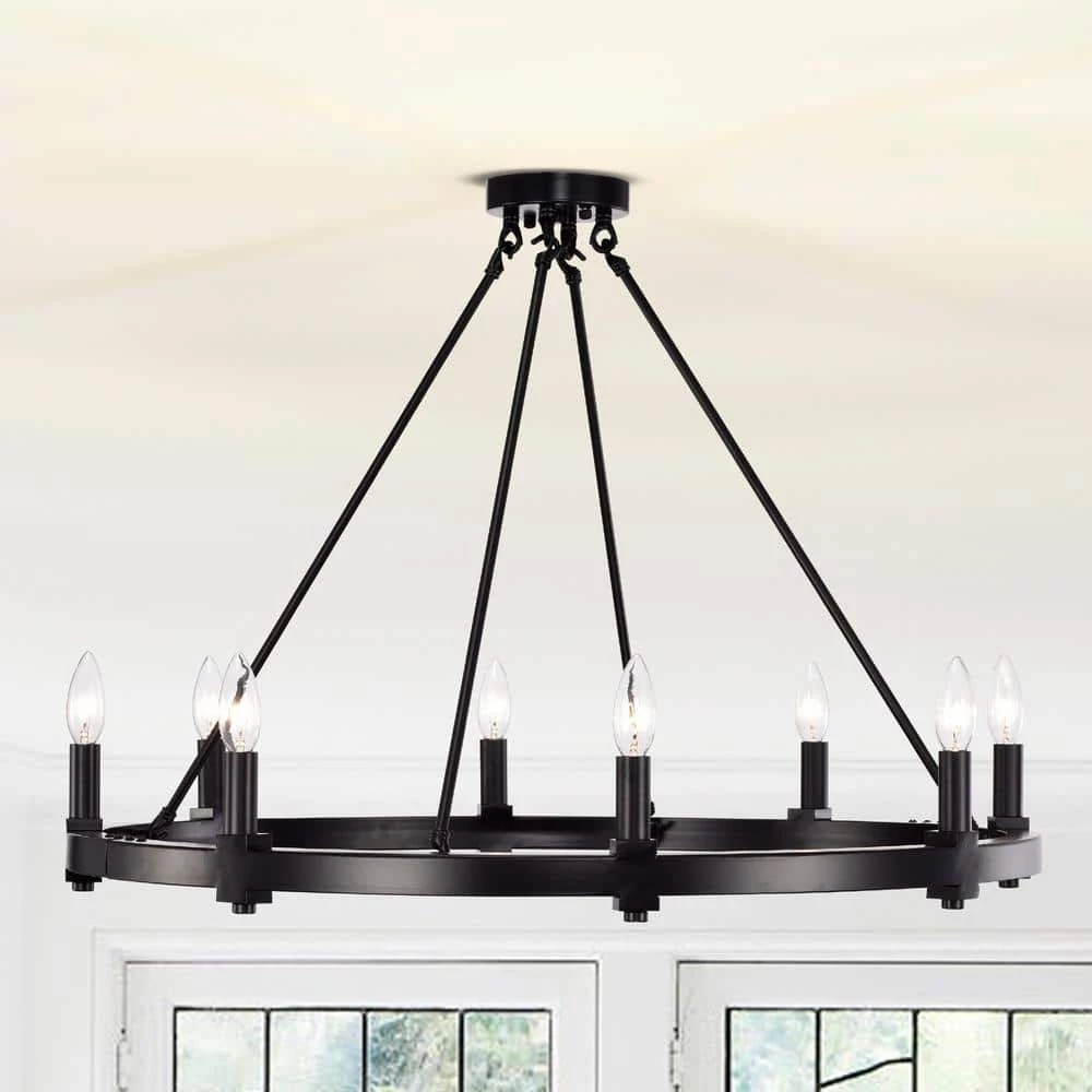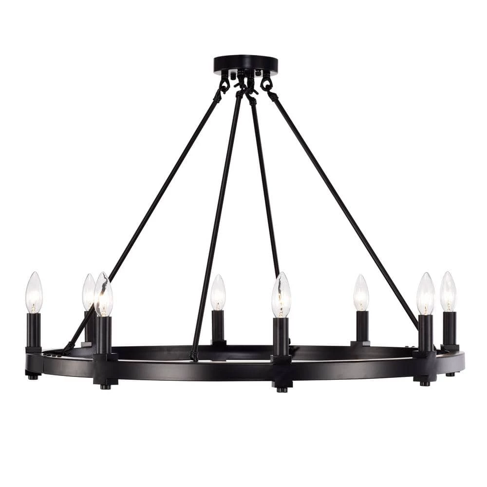 This 8-light wheel chandelier features a beautifully hand painted matte black finish that will compelement many classic and traditional decors throughout your home. The smooth, clean lines of the metal frame add interest while the exposed bulbs will provide ample light for many spaces. Its chic minimalist metal circle is finely crafted with a rich finish that adds luxury to any living room or dining room.