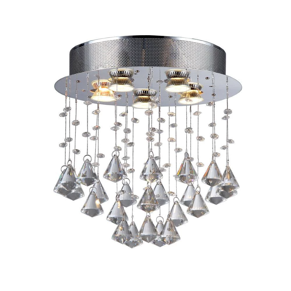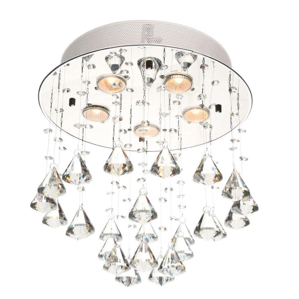 This 14 in. Catherine Crystal Chandelier offers an elegant clear tone crystal cut glass and silver chrome finish which perfectly blends to complete the look. The Five 40-Watt Halogen illuminate your room with sophisticated lighting. Furnish your home with a magnificent innovative design of fine crystal art glass.