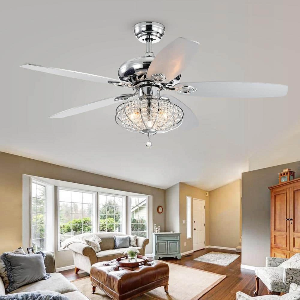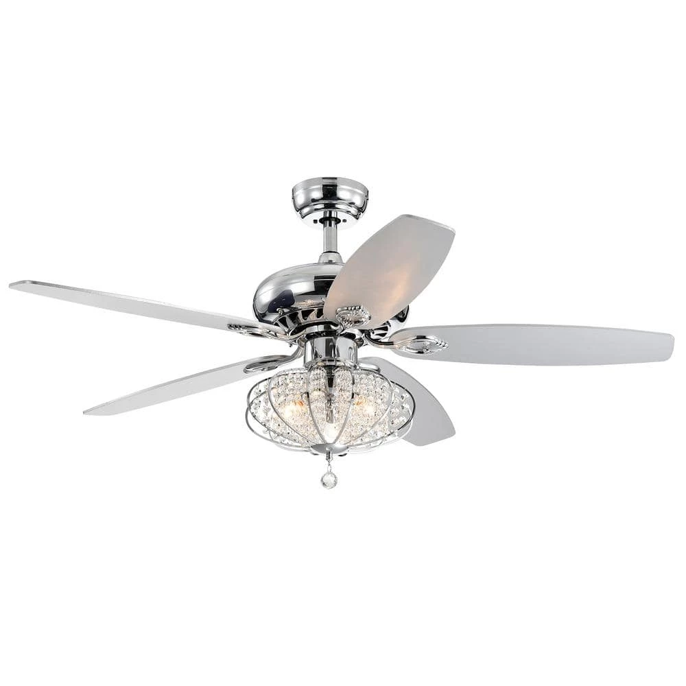 This lighted chandelier ceiling fan is the perfect solution for your cooling and lighting needs. The cage-like shade features a chrome finish with beaded crystals for elegant design. The 3-light bulbs provide plenty of illumination. Remote Controlled for your cooling convenience.