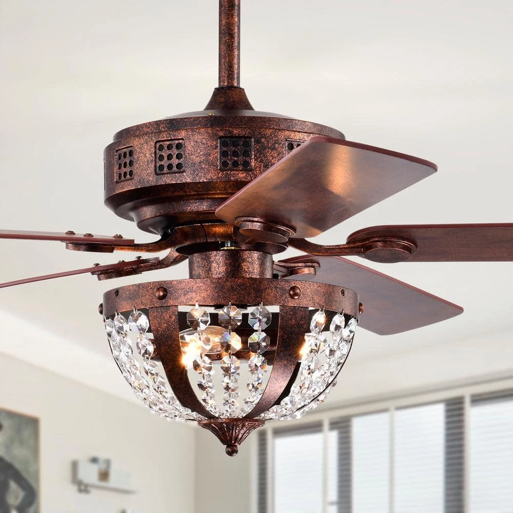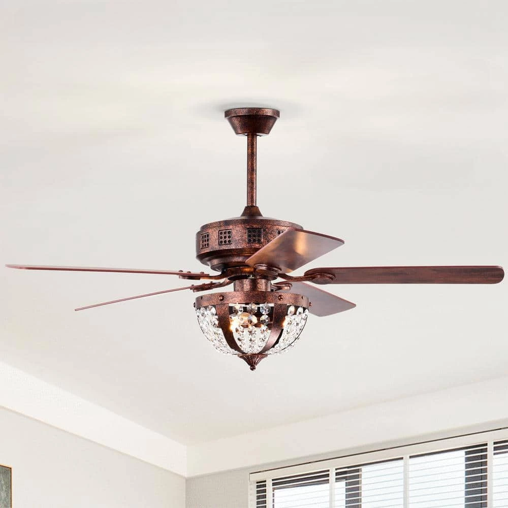 Allow your home to become an aesthetic galore with our 52 in. Antique Copper Chandler Ceiling Fan Chandelier. Our fixture features three (3) lights that are accompanied by a crystal-decorated shade which allows your home to turn into a dream come true when you bring the light to life. Included is a remote control that allows you to toggle through the three (3) airing options for your cooling comfort, with ease. Both decorative during the day and decoratively functional at night, get the best of both worlds with our 52 in. Chandler Ceiling Fan Chandelier.