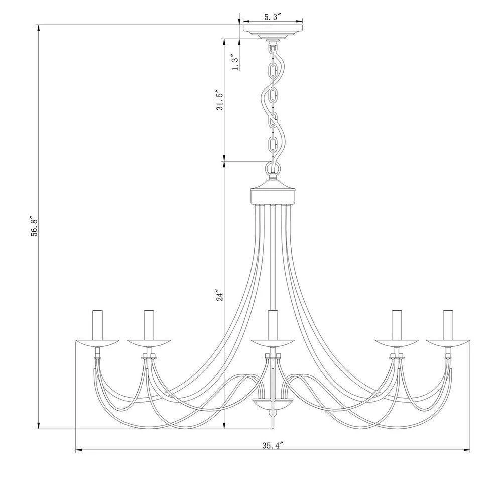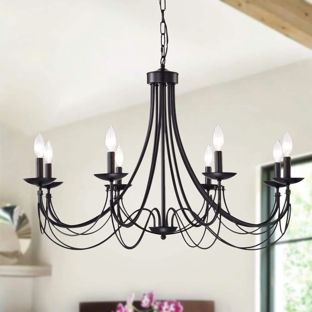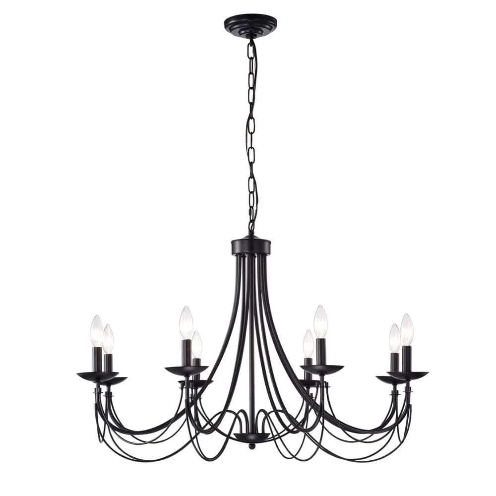 Add this impressive matte black single tier classic branched chandelier to your home. 8 candelabra style lamps offer great illumination. Main branches have additional dual cursive branched support bars.
