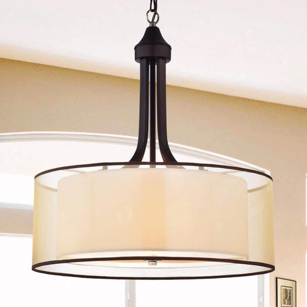 Liven up your living space with this 20 in. Pendant Lamp. This lamp features bronze metal and a beige shade. This lighting fixture is constructed with a beautiful antique bronze finish with an off-white fabric shade.