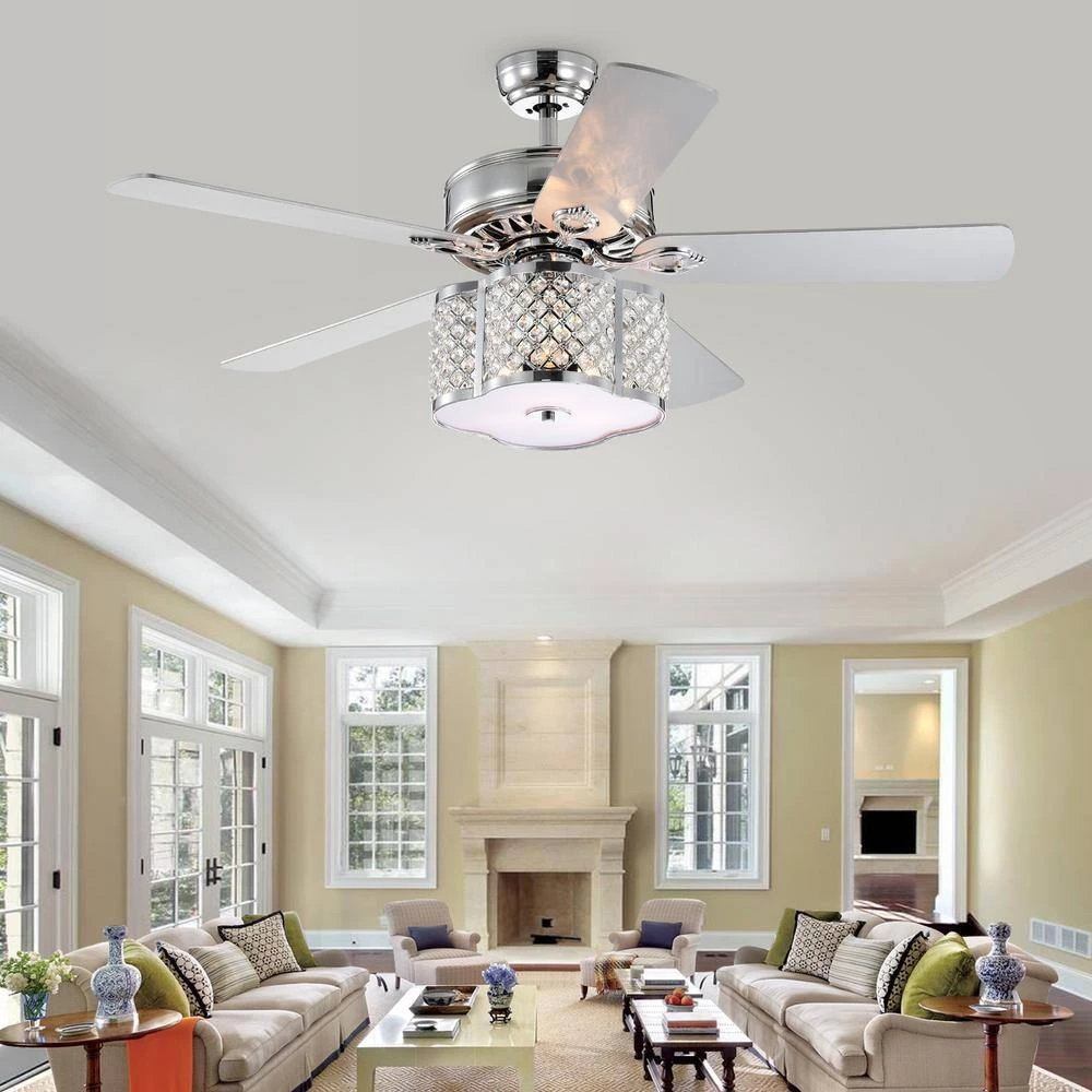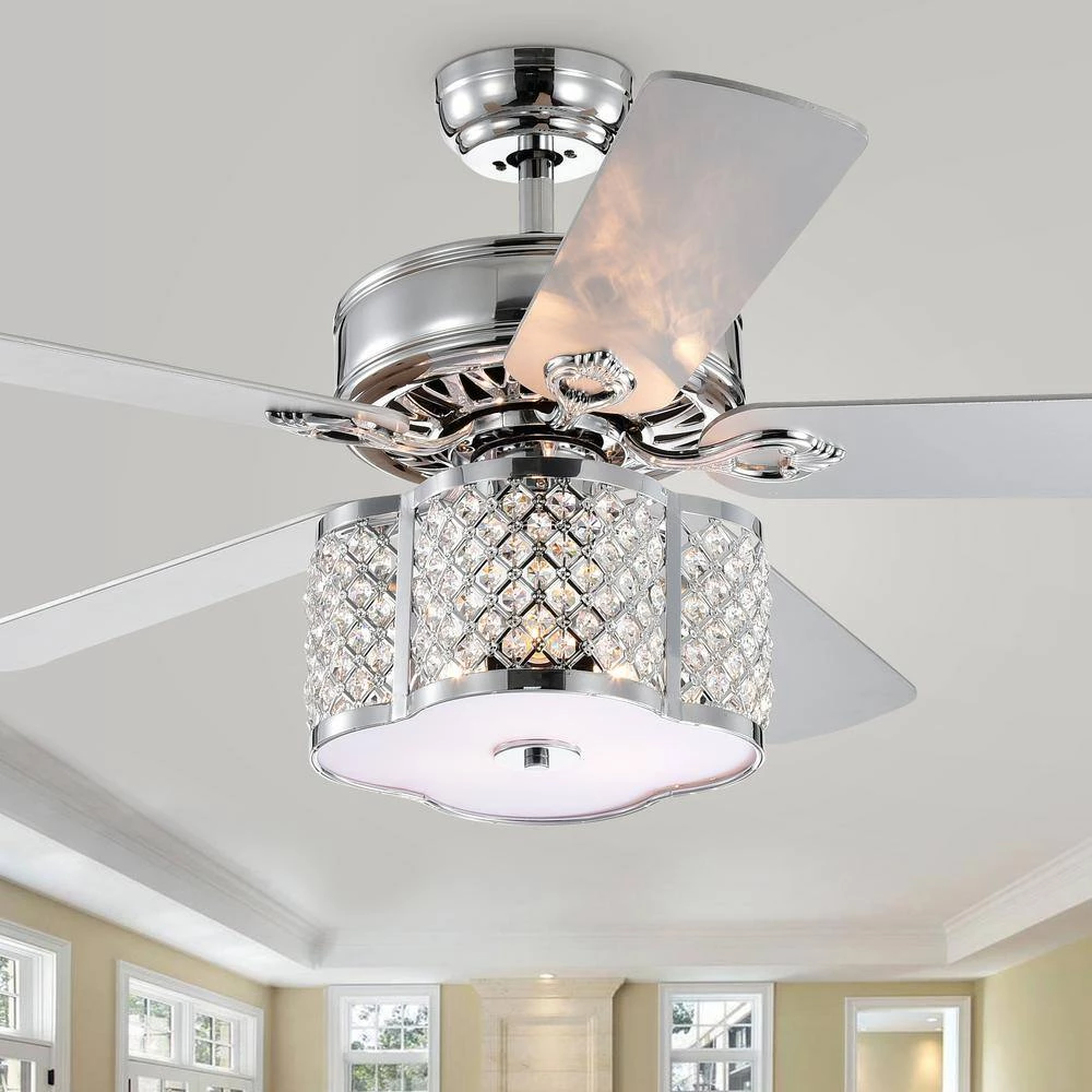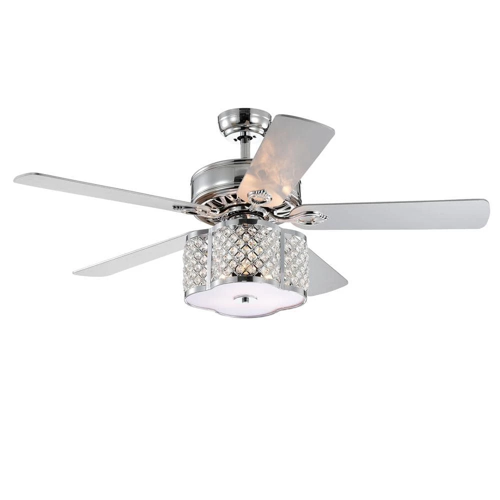 This lighted ceiling fan featuring a chrome and crystal floral shade is an elegant solution. The 5 reversible wooden blades provide ample air flow and flexibility in decorating. 3 speed reversible motor insures you find just the right comfort level. The remote-controlled functionality offers additional convenience.