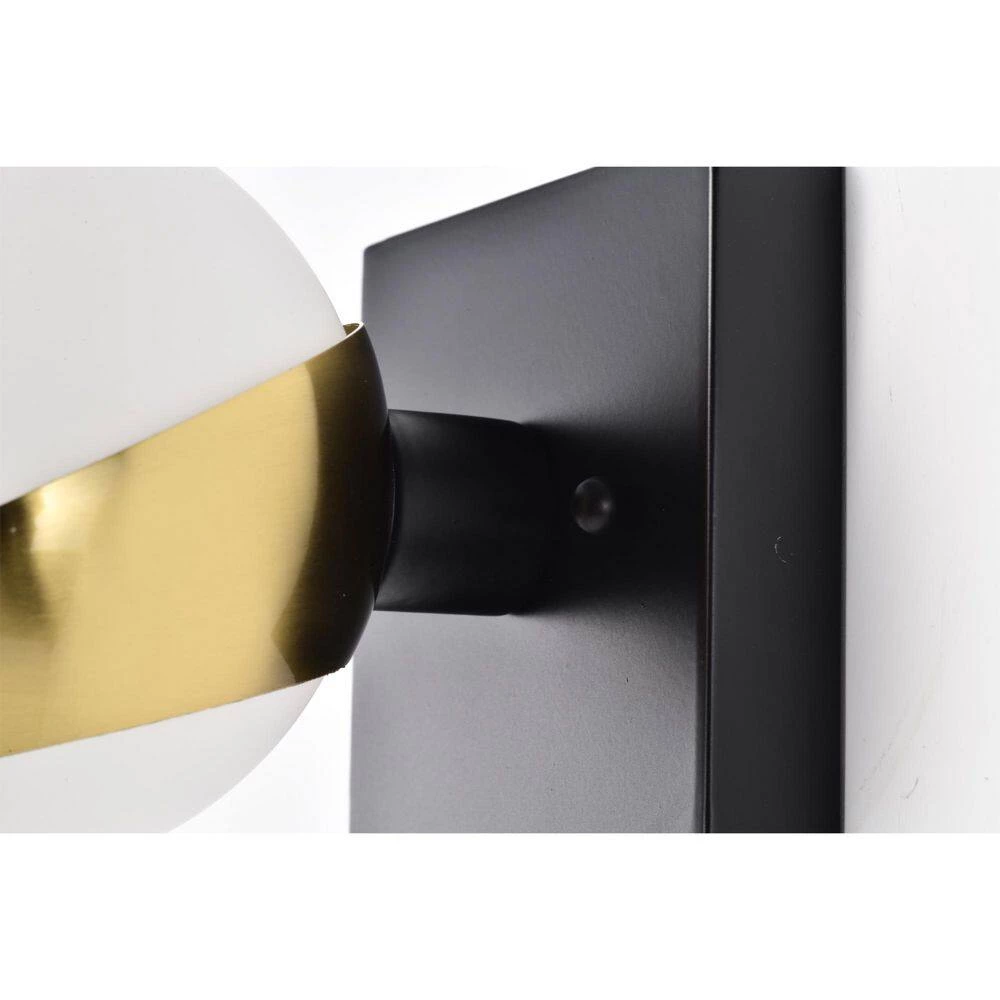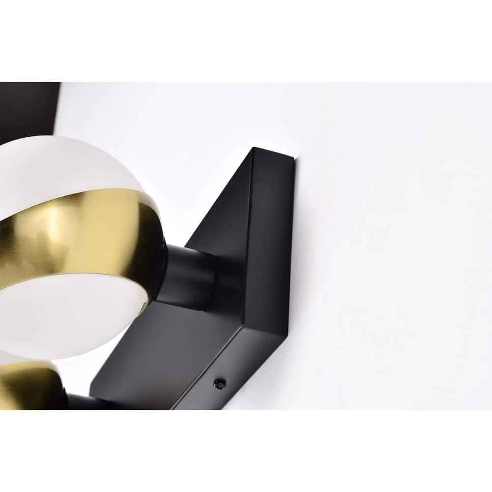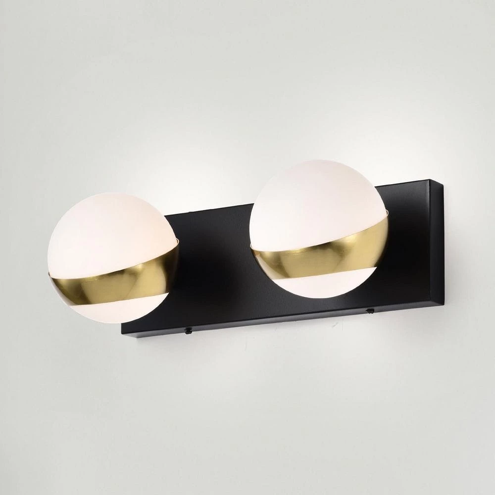 Decorate and bring your home interior to life with the help of our 14 in. Matte Black and Matte Gold Duo Wall Sconce. Our fixture features 2-lights, two (2) frosted White globe glass shades and garnished in Gold our design comes in full circle to present a lovely display. Decorative during the day and decoratively functional at night, get the best of both worlds with our 14 in. Duo Wall Sconce.