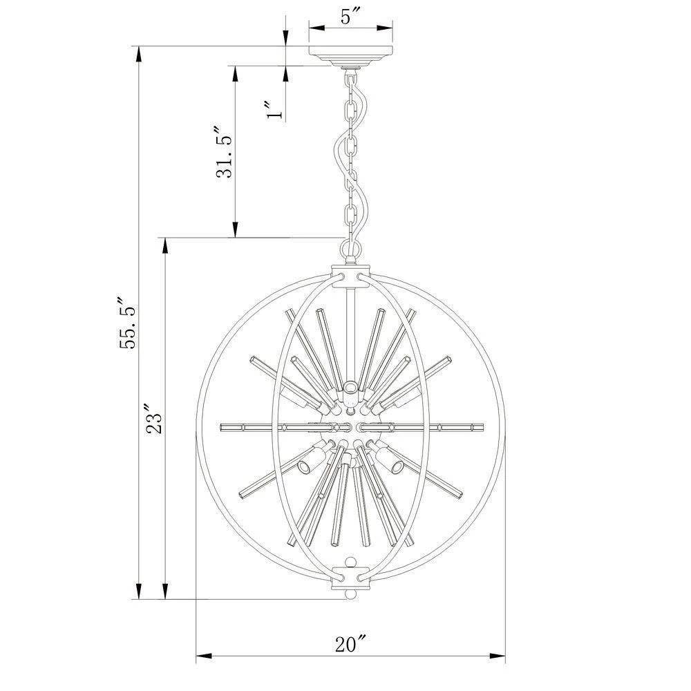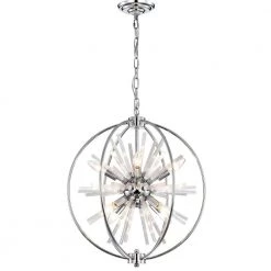 Make a bold statement with this Dyords chandelier. 8-light and an array of crystal rods extend out from the center in a starburst design for a bright shimmering effect. A globe-shaped cage frame creates an artistic look and the chrome finish adds an extra pop of shine.