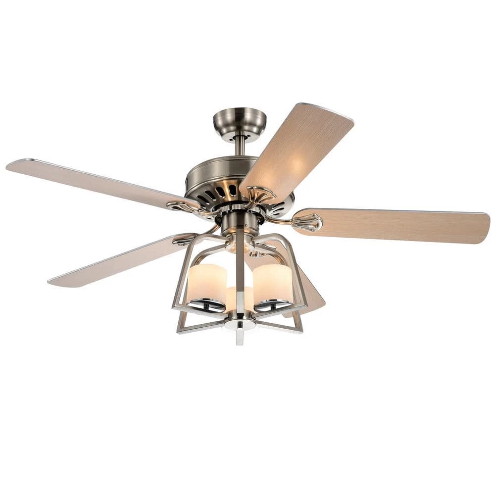 Suspend this Edreyan 5-blade ceiling fan above your living room to improve the quality of the air in your space. Featuring a 3-light chandelier lamp to illuminate your living room while giving it an elegant vibe this ceiling fan has a forward and reverse motor allowing you to regulate the temperature of your room throughout the year. Constructed from metal and wood that offers durable utility this ceiling fan has a remote control making it convenient to operate. The light fixture has a satin nickel finish that provides contemporary charm. This satin nickel finished ceiling fan item from Warehouse of Tiffany gives uniqueness 3 bulbs design and good quality to your homeit also adds some calmness stay together with your love ones. The said product has 5 plywood blades with white front side and silver color on the back.