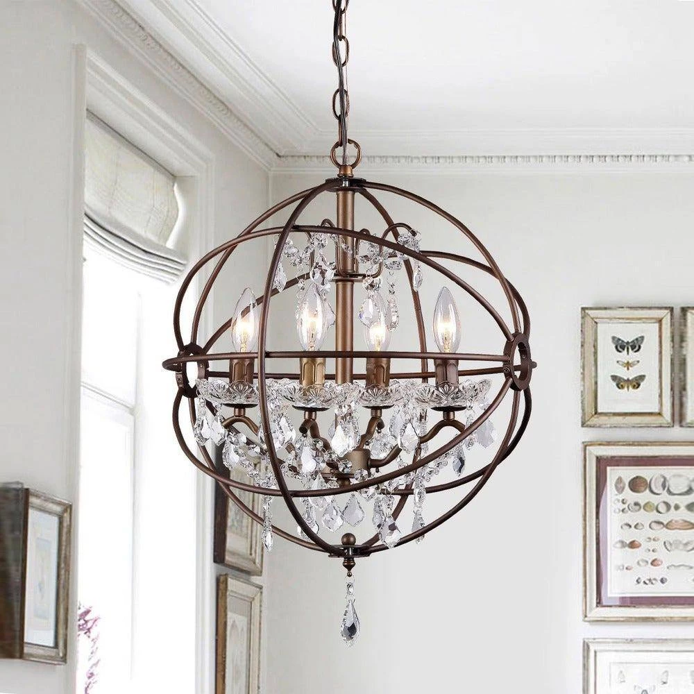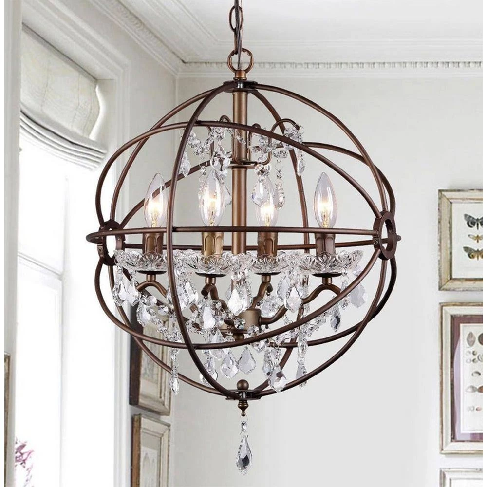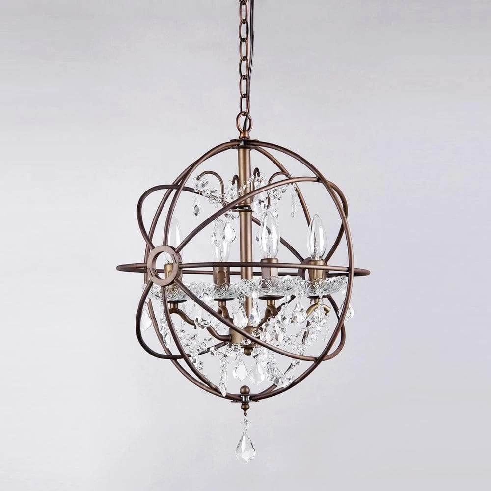 With vintage charm and an old world feelthis 4 light chandelier adds unique character to any room in your home. This bronze chandelier features beautiful teardrop crystals that reflect light and give your room a softinviting glow. As an eye-catching statement piecethis chandelier complements and contrasts with your existing home decor.