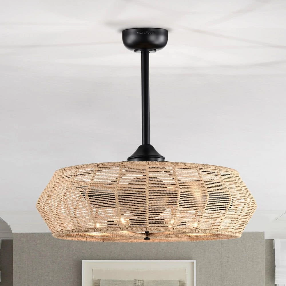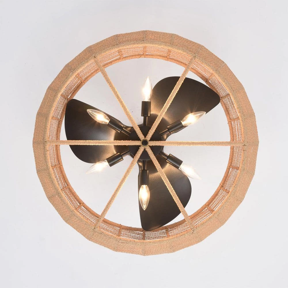 Allow your environment to radiate off peace and cool breezes with the help of our 28 in. Matte Black and Beige Rattan Emma Ceiling Fan Chandelier. Our fixture features 6-lights, a Beige woven rattan shade, and 6 fan speeds that is bound to find your right level of cooling comfort. Decorative during the day and decoratively functional at night, get the best of both worlds with our 28 in. Emma Ceiling Fan Chandelier.