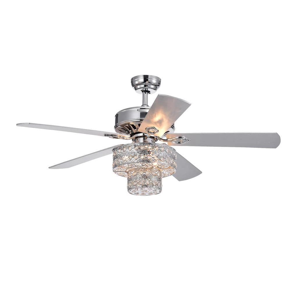 The shade is 2-tiered with crystal embedded stamped metal walls. The richly traditional design is meant to compliment any luxurious space. Cool your home with style.