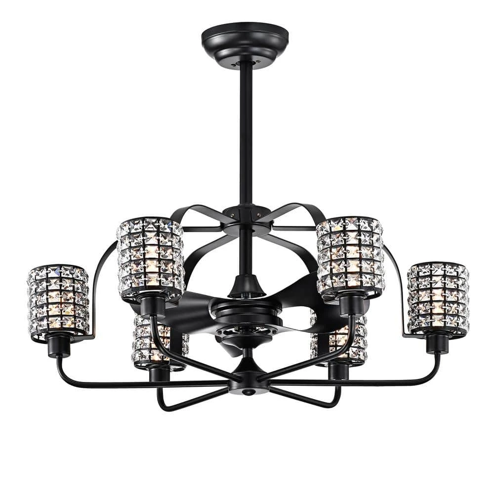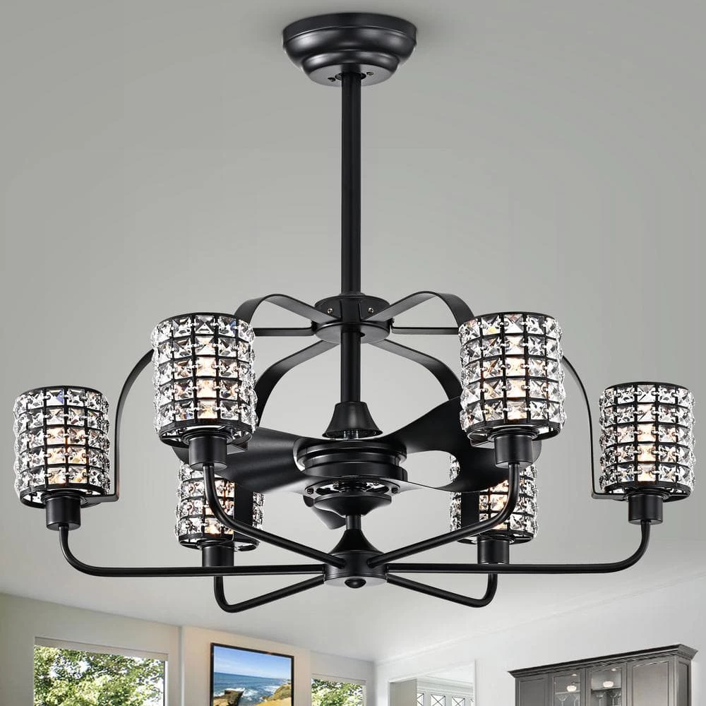 This unique modern fandelier is the perfect solution to improve your home. 6 branched lamps all decorated with crystal shades emit excellent illumination. The 6 speed reversible motor insures you find just the right level of cooling comfort. The remote-controlled functionality offers additional convenience.