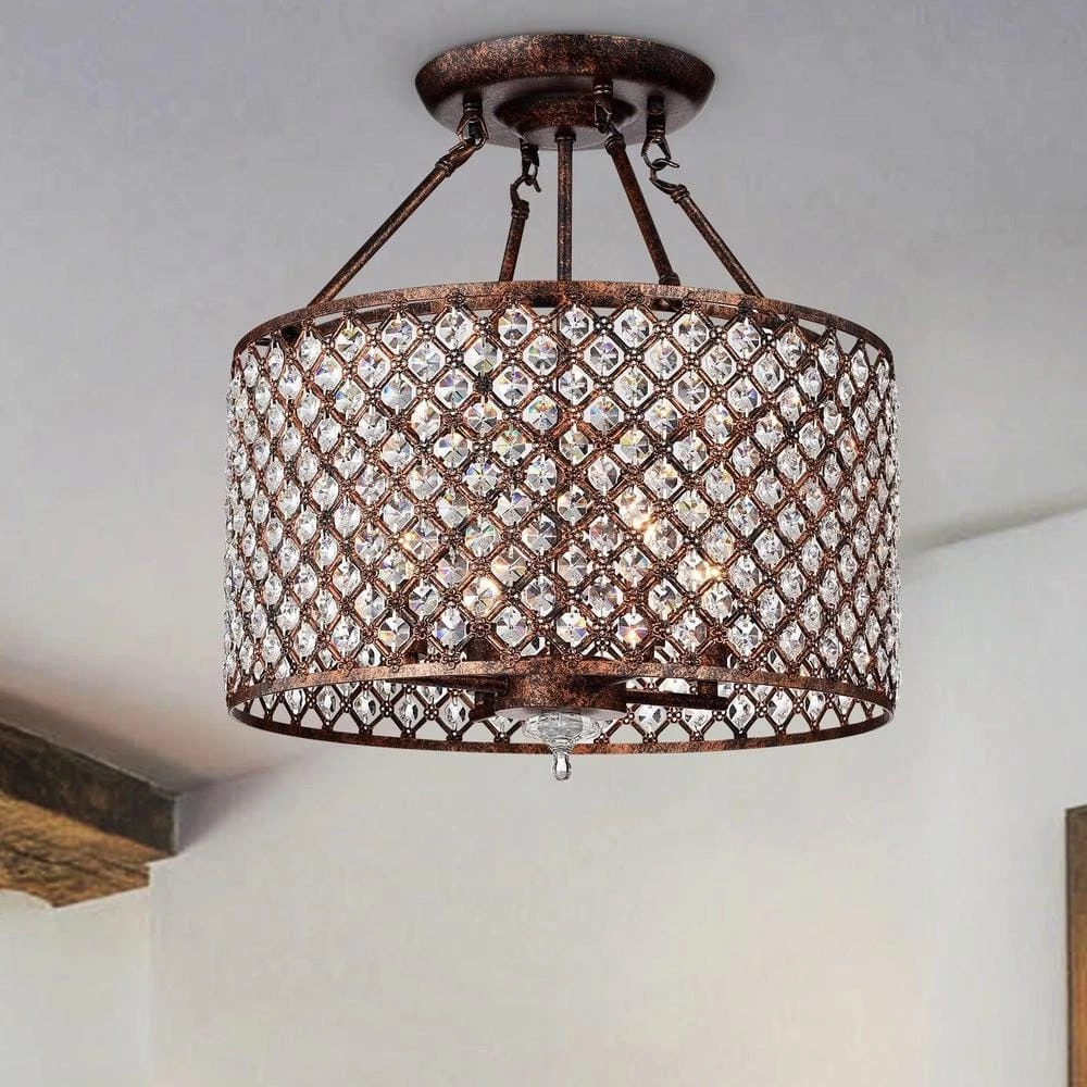 Highlight your kitchen with the delicate Estela Semi-Flushmount. Teardrop crystals hang from the sides and center of this piece and shine prisms of light when illuminated. The antique bronze frame contrasts the crystals with delicate lattice work that your guests will love.