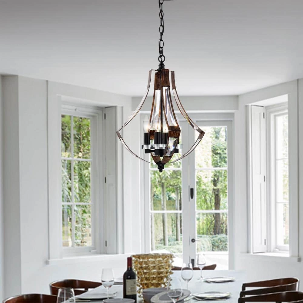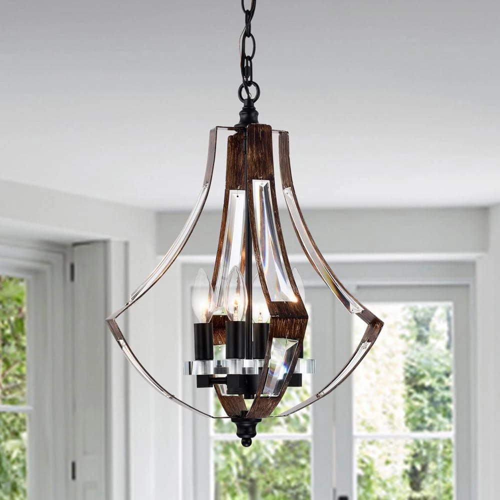 Our 15 in. Matte Black and Faux Wood Grain Fabiola Pendant introduces a rustic, yet elegant design that enhances your space like no other. Finished in a Dark Brown Faux Wood Grain, this fixture includes four (4) lights that shines nicely through the glass baguettes that are embedded in the pendants design. You get the best of both worlds with our 15 in. Fabiola Pendant Chandelier as it’s decorative during the day and illuminates with charm at night.