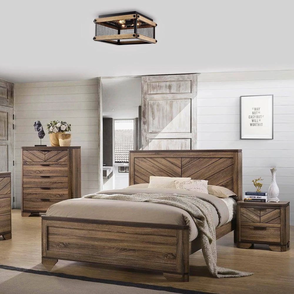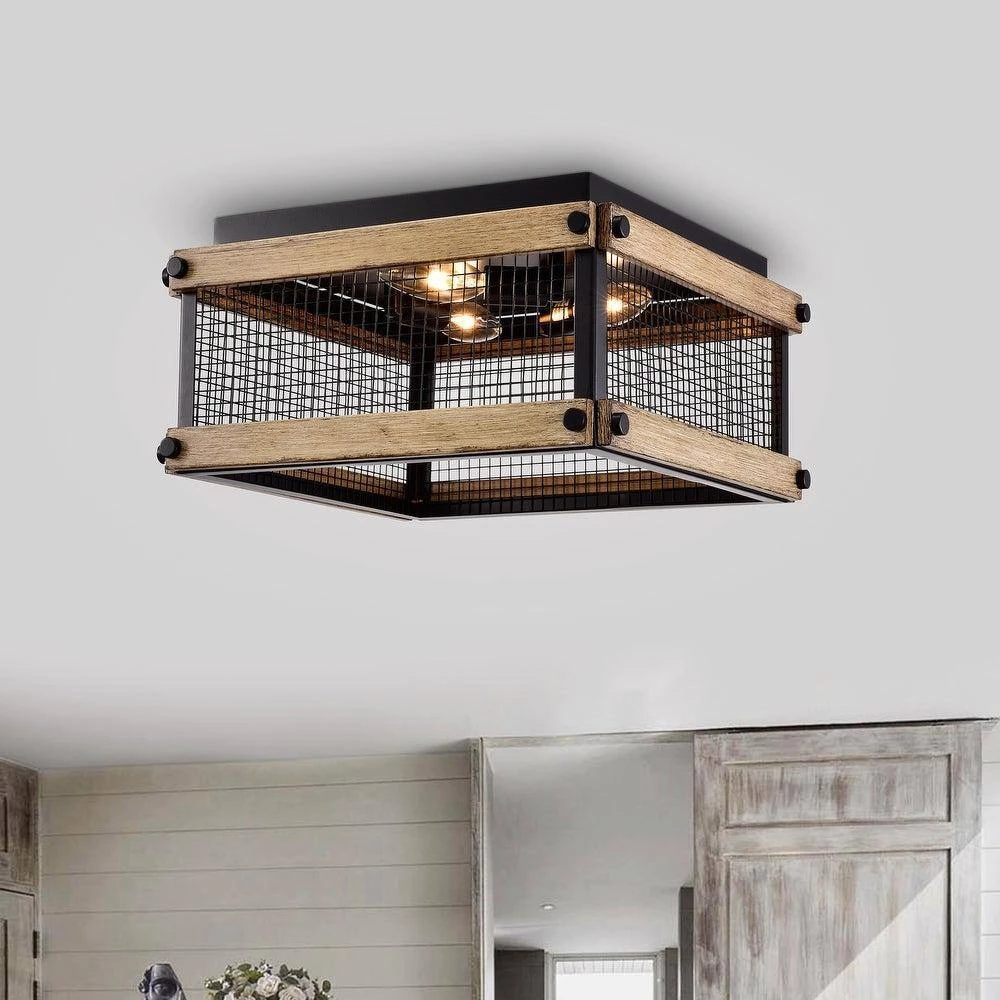Complement your decor with the traditional charm of this flush mount lighting fixture. The matte black finished metal shade displays a geometric design while the top and bottom frames of this lamp showcases an imitation wood grain finish for a vintage appeal. The 3-lights design provide plenty of illumination in any room.