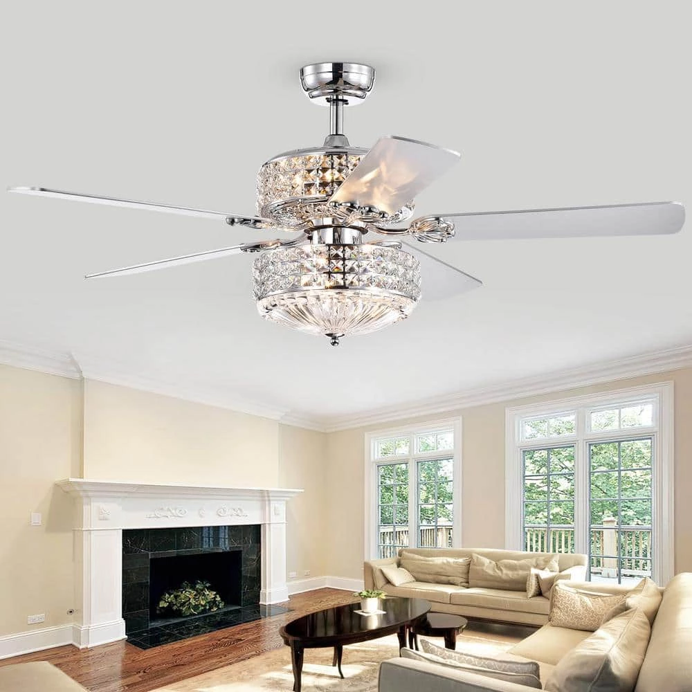 Keep the temperature comfortable year round and save money from having to turn on the air conditioning, this is only one of the benefits of installing a ceiling fan. This lighted ceiling fan introduces an elegant old world glamour and style. Both upper and lower crystal shades are lighted and offer excellent illumination. The bowl type shades use a chrome grid drum with nested crystal gems. A 3-speed motor insures you’ll find just the right level of cooling comfort that you can control with the remote control that is included.