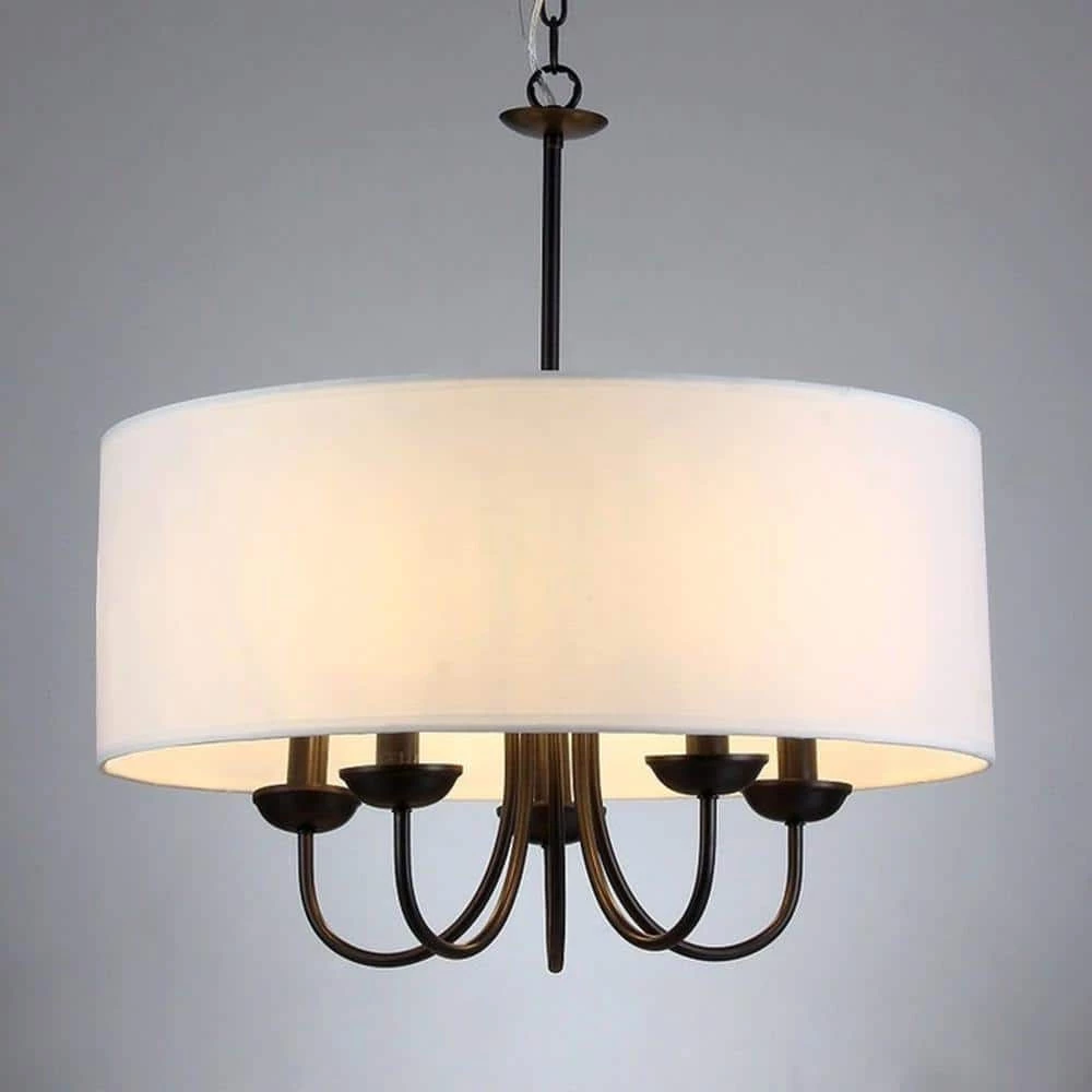Light up your home with the unique style of this Gwenevere chandelier. This 5-light chandelier is carefully crafted of iron and fabric to bring you a high-quality piece that will last in your home for years. As beautiful as it is functionalthis chandelier has a white fabric shade complemented by a black finish. This contemporary lighting fixture will fill your home with brightness to enhance your space. This chandelier features a simple and sophisticated design that will captivate anyone’s eyes.