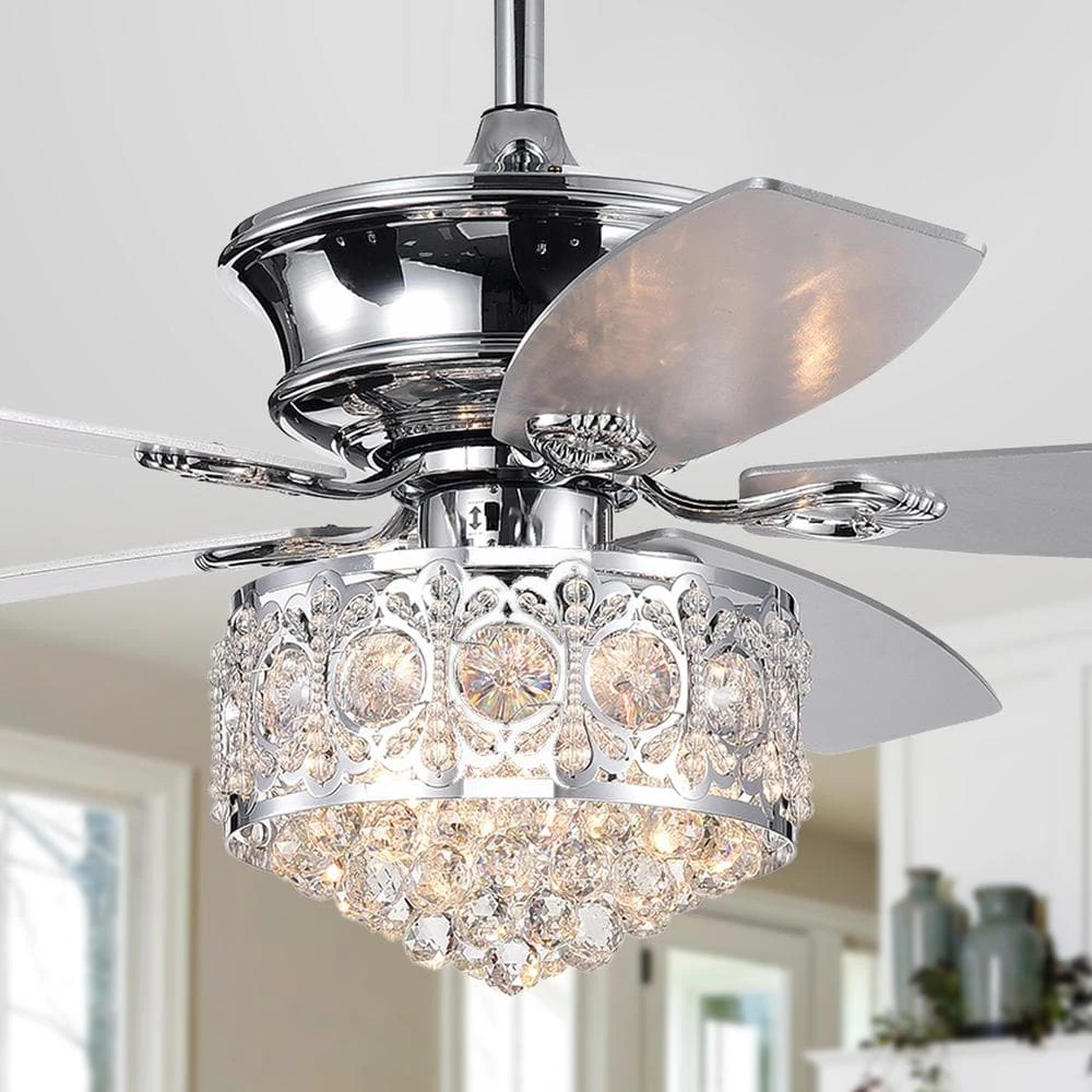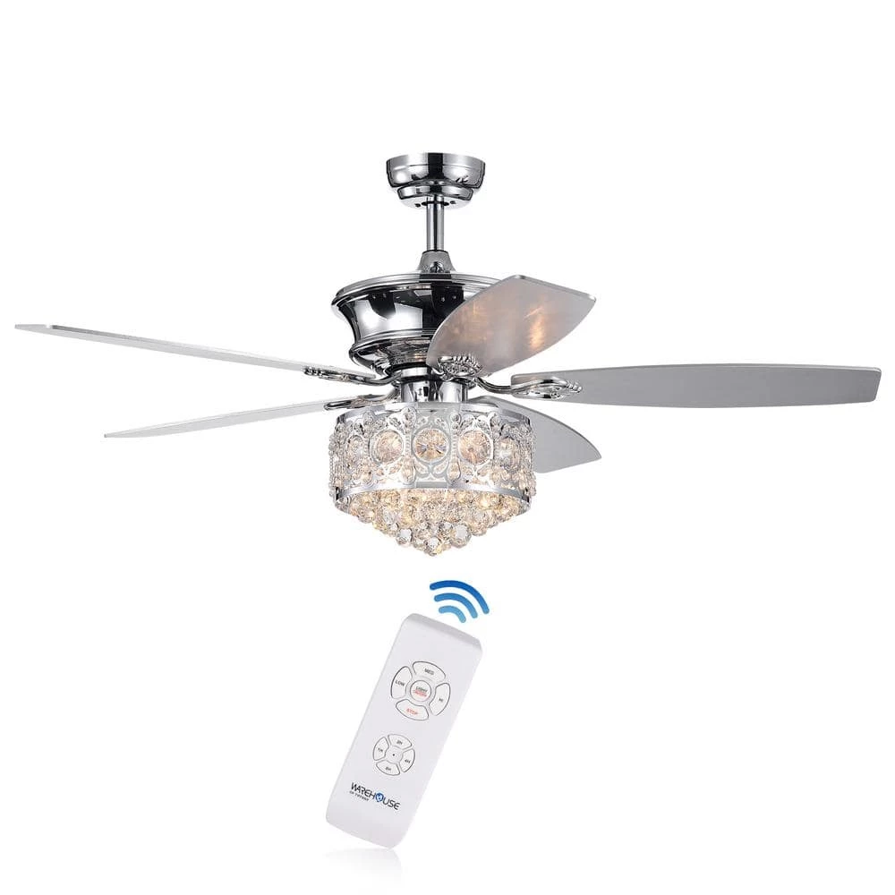 Grace your home with this elegant Hasna 52 in. ceiling fan to keep your living space cool and cozy. The 5 reversible wooden blades enable a style change whenever you feel like sprucing it up, and the crystal drum chandelier shade reflects light from the 3-bulbs for stunning beauty. This ceiling fan features a variable-speed reversible motor for increased airflow control.