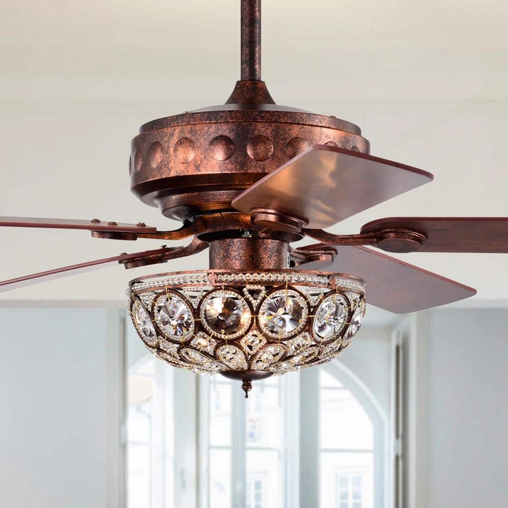 Fill in the missing piece that your home (or business establishment) has been having with our 52-inch Antique Copper Ceiling Fan Chandelier. Our fixture features three (3) lights that are housed in a royal-like shade that illuminates your environment with honor. Included is a remote control to help you navigate through and choose from the three (3) airing options that are available for your cooling comfort. Both decorative during the day and decoratively functional at night, get the best of both worlds with our 52-inch Jasiah Ceiling Fan Chandelier.