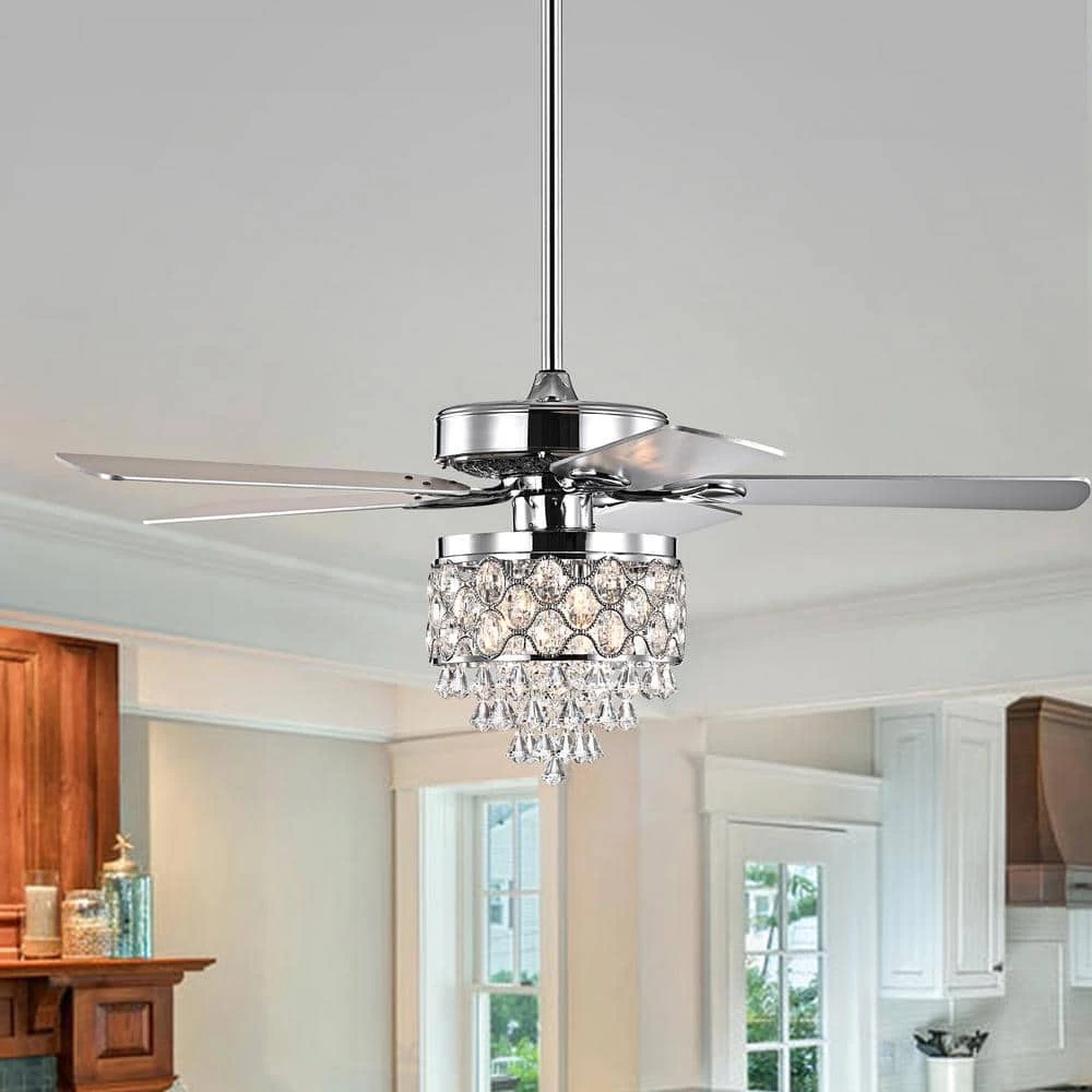 Illuminate your home with this elegant lighted ceiling fan to keep your living space cool and cozy. With chrome shade and four-tier crystals sparkling inside drawing the eye down to the bottom, this crystal ceiling fan glimmers and shines when lit up. The 3-speed motor ensures you find the exact setting for your stimulating comfort. The remote-controlled functionality offers additional convenience.