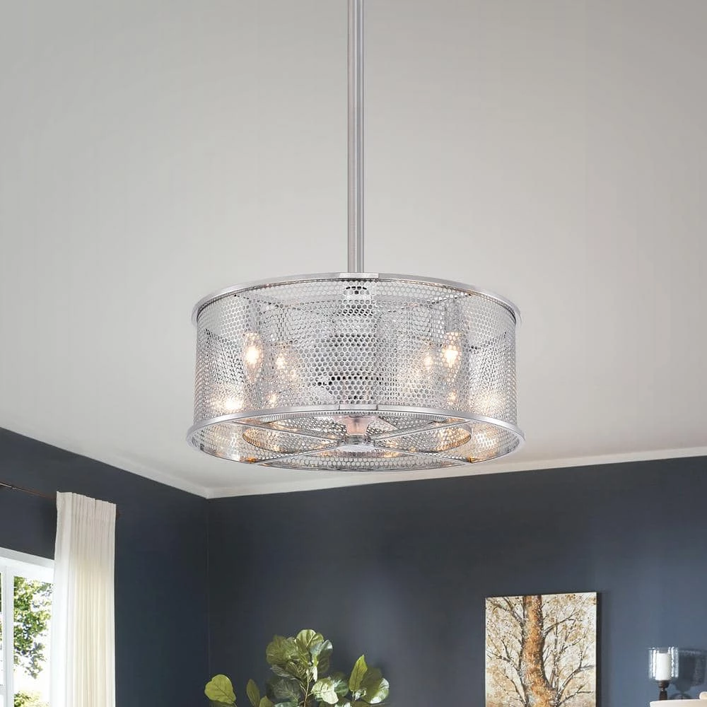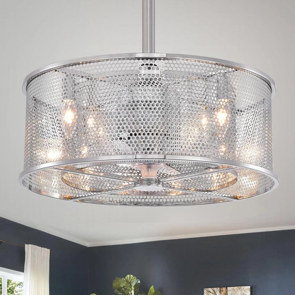 The outer metal shade uses a honey comb style grid for a great design and structural integrity. The 4-lights provide ample illumination and the 3-speed motor lets you find the right cooling comfort. Remote Controlled for additional convenience.