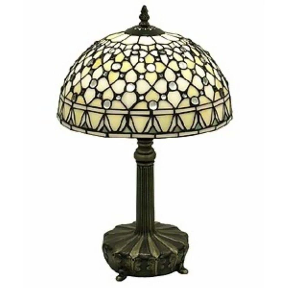 This 19 in. White Jewel 1 Light Table Lamp will add flare of elegance to your home or office with this stunning white jewel lamp. It features Tiffany-style stained glass and cast-metal base in bronze finish. The One 60-Watt standard bulb provides illumination and enhances the beauty of each cut glass to your room. Shade contains more than 150 pieces of hand-cut glass wrapped in fine copper foil and accented with rich vibrant cabochons.