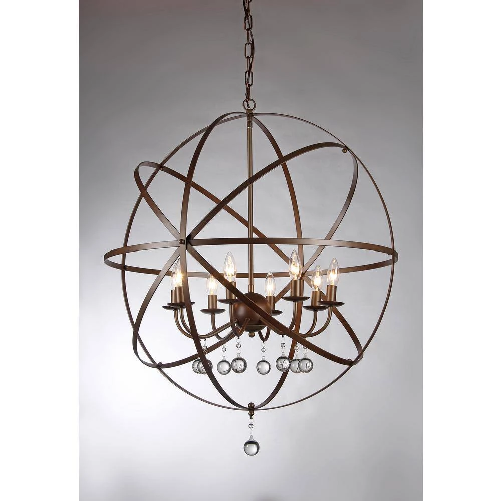 Functional and fascinating, this chandelier will add a bright and unique touch to your room. The chandelier is crafted into the shape of a globe using bands of crossing metal. An eight light candelabra hangs inside the globe. Round crystal bobbles drop from each light. A single bobble hangs from the bottom of the globe. The bronze finish and exclusive design make this chandelier striking and brilliant.