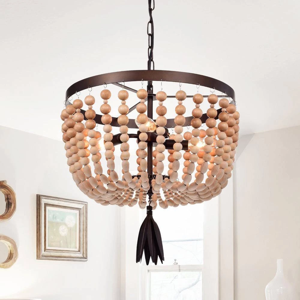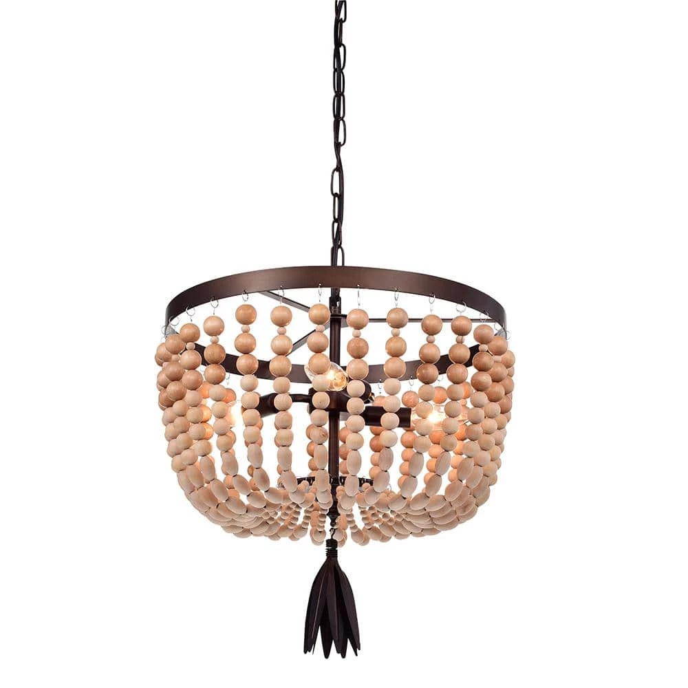 This earth friendly wooden bead pendant with antique bronze framing is perfect for any space. The wooden beadwork drapes to form the traditional bowl shaped shade. The bottom finial hangs a bundle of metal leaves to complete this lovely design. Hang above your dining room or in any space needing extra lighting.