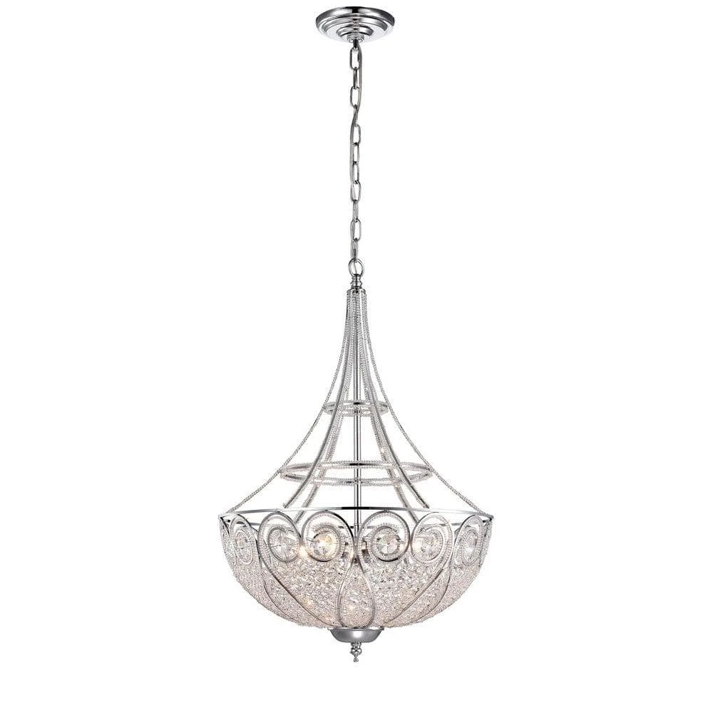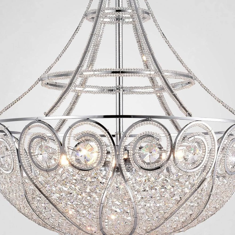 This chandelier imitates arts and life. The exquisite details are displayed on this crystal chandelier. Draped with crystal bead strands held by crystal rings and adorned with crystal drops to a single crystal spherea definite grandeur piece.