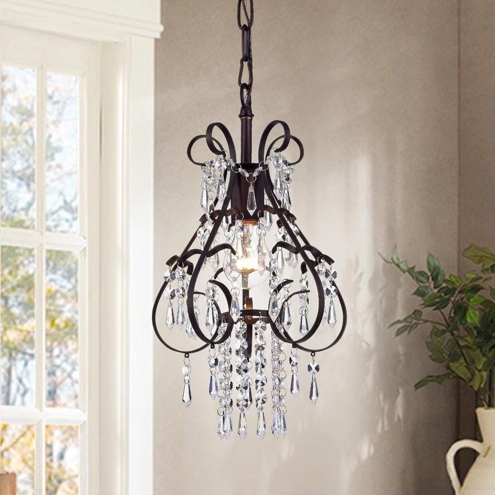 Bring dramatic glamour to your dining room or living room with this Kerime antique style crystal and metal pendant. The scrolled metal base frame is finished in dark bronze for antique allure. The large, clear, bulb-shaped lamp holder offers a dash of industrial chic, and crystal teardrops add tons of sparkle to your room decor.