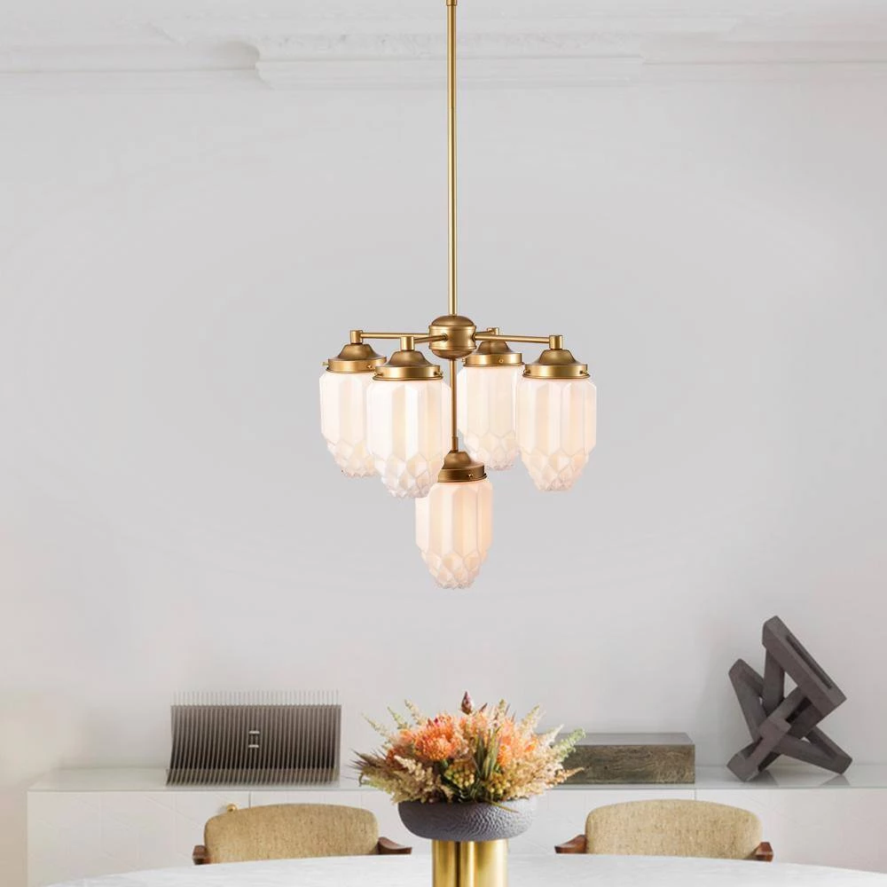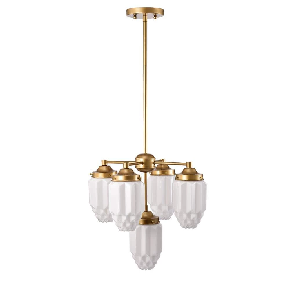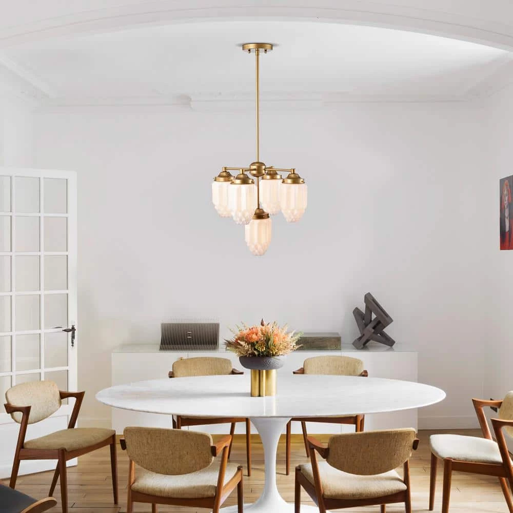 Brighten up your interior space with this 5-light chandelier. This lighting fixture has a matte gold finish with frosted glass shades. The cone glass shades suspended by metal bars offer a dazzling focal point for your decor.