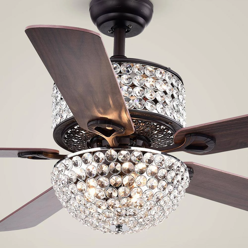 This 5-blade Remote Controlled Ceiling Fan is bedecked in prismatic crystals that both refract the light from the 6 bulbs as well as give the fan a feeling of composed radiance reminiscent of the art deco period. Metalwork is finished in an antique bronze patina. Both upper and lower crystal shades are lighted.