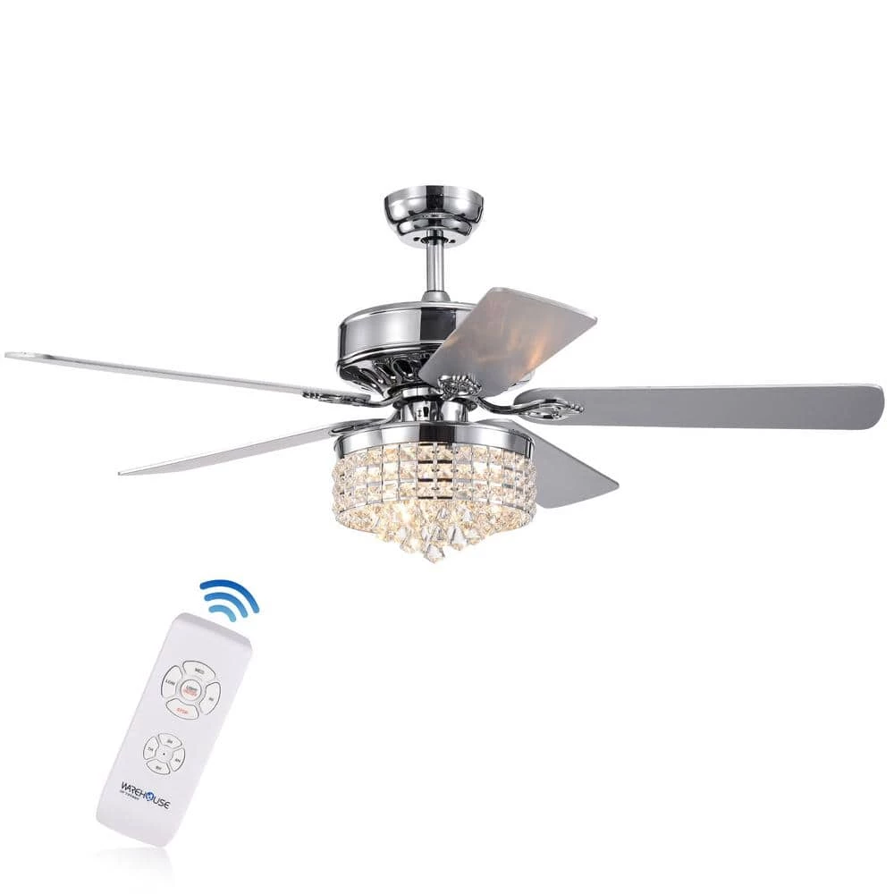 Remote Controlled Ceiling Fans are the most cost-efficient option on bringing the temperature down and moving stale air out of rooms. This lighted chandelier ceiling fan is the perfect solution for your cooling and lighting needs. The matching silver stained wooden blades compliments the Chrome base. The 3-speed reversible motor insures you find the exact setting for your cooling comfort.