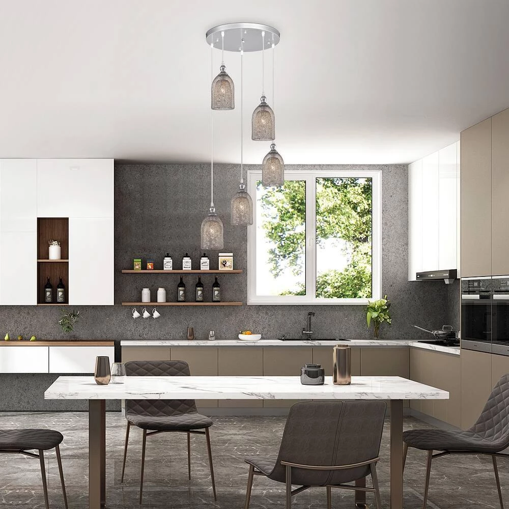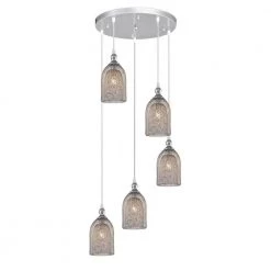 Insert visual interest to your home with this pendant grouping from Warehouse of Tiffany. 5 mismatched metal shades hang in a cable cluster and give off warm light when lit. The bell-shaped metal shades feature diamond-pattern design embedded with diamond-cut clear crystals for elegant appeal. The chrome finished ceiling base adds a modern feel to the identical shades and makes this an ideal lighting for contemporary homes.