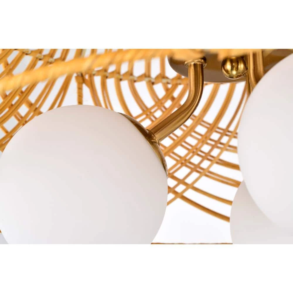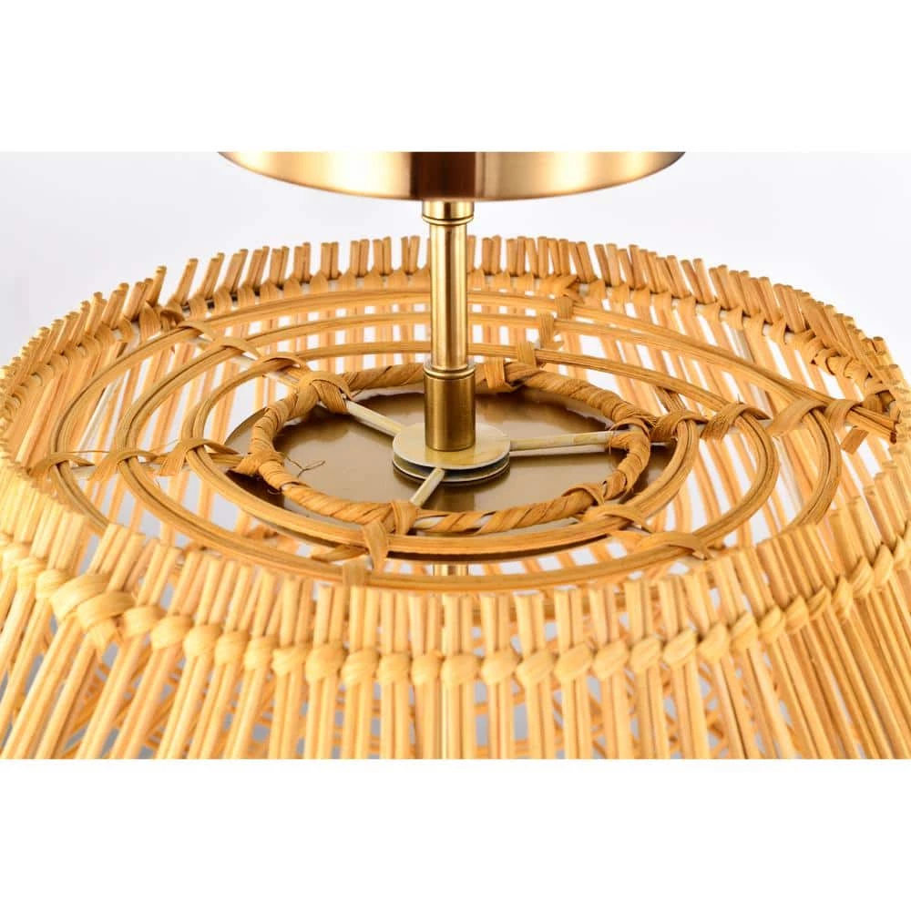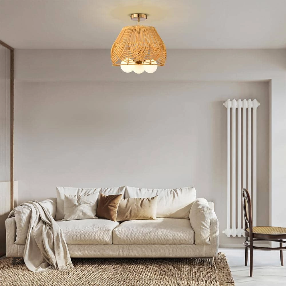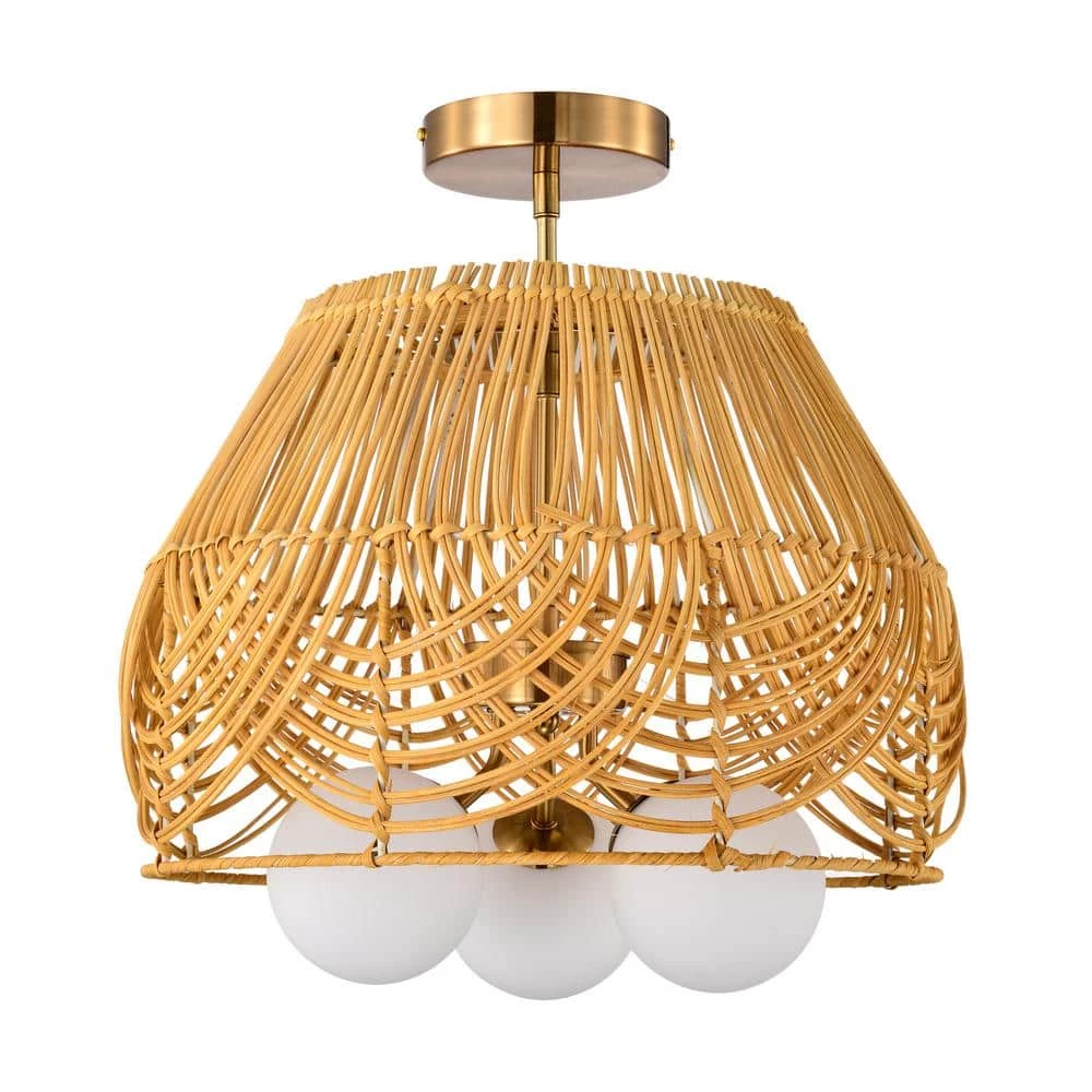 Introduce a refreshing environment into your home with our 15 in. Brass and Woven Rattan Lucilla Semi-Flush Mount Ceiling Light. Our fixture features 3-lights, a woven rattan shade and frosted White globe style shades. Decorative during the day and decoratively functional at night, get the best of both worlds with our 15 in. Lucilla Semi-Flush Mount Ceiling Light.