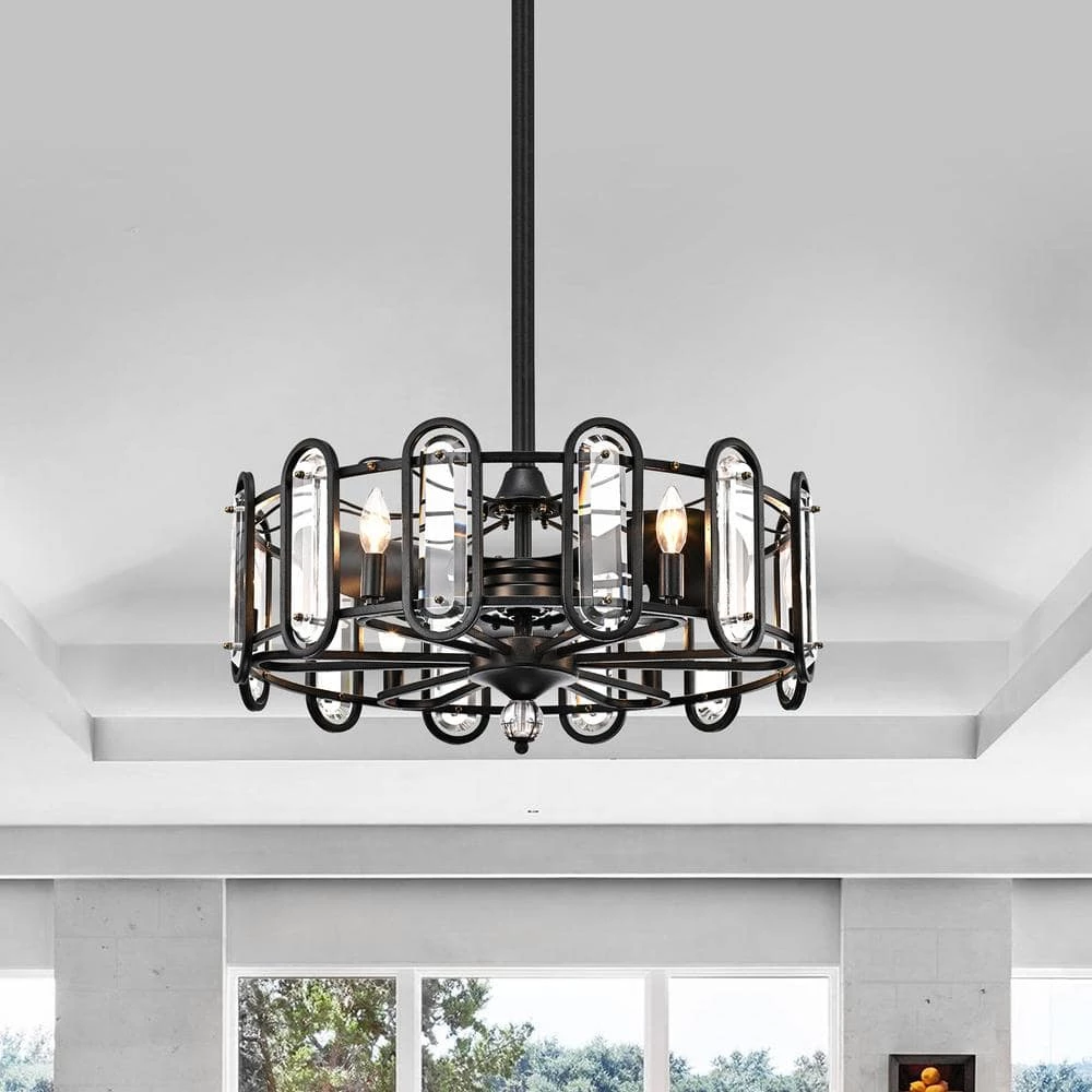 This fandelier type ceiling fan is a glamorous solution. It features a drum-shaped metal shade with a forged black finish for that aesthetic look and six candelabra light bulbs for ample illumination. Remote controlled for your cooling convenience.