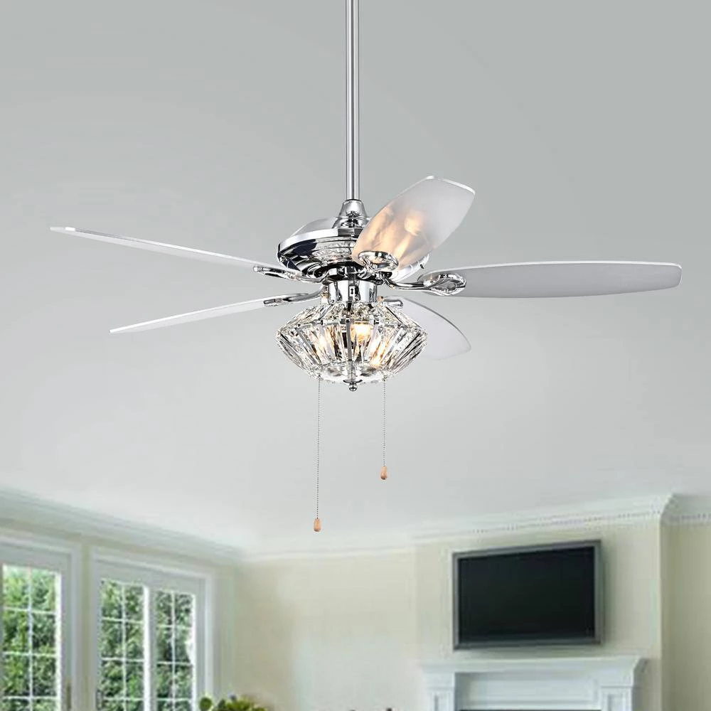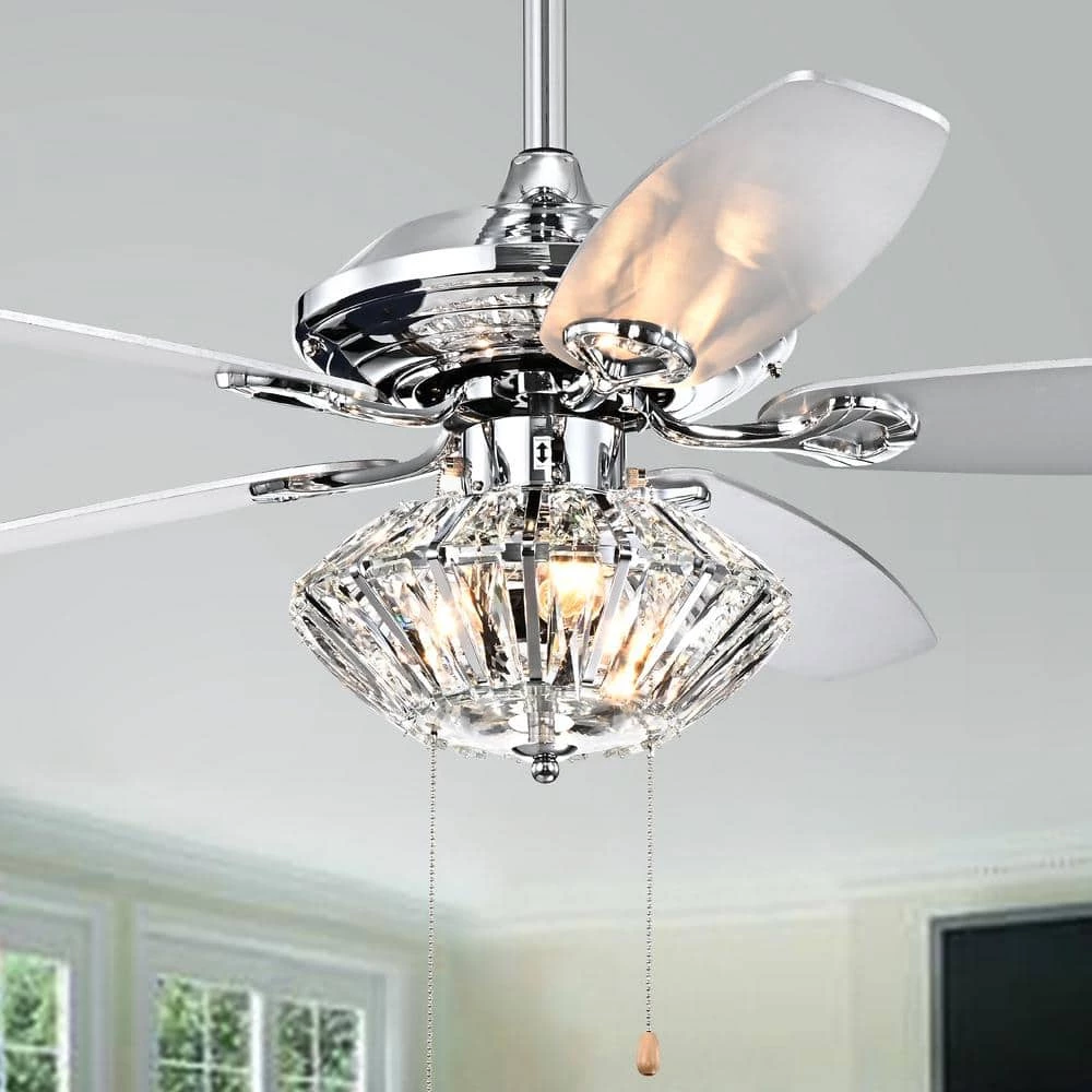 Keep the temperature comfortable year round and save money from having to turn on the air conditioning. These are only some of the benefits of installing a ceiling fan. This multi-faceted geometric styled lighted ceiling fan is a beautiful solution. Brilliant lighting is achieved from the gem shaped form with high quality crystal baguettes for each face. The polished chrome finish and silver stained wooden blades make is excellent most design applications. 3-speed reversible motor insures you find just the right level of cooling comfort.