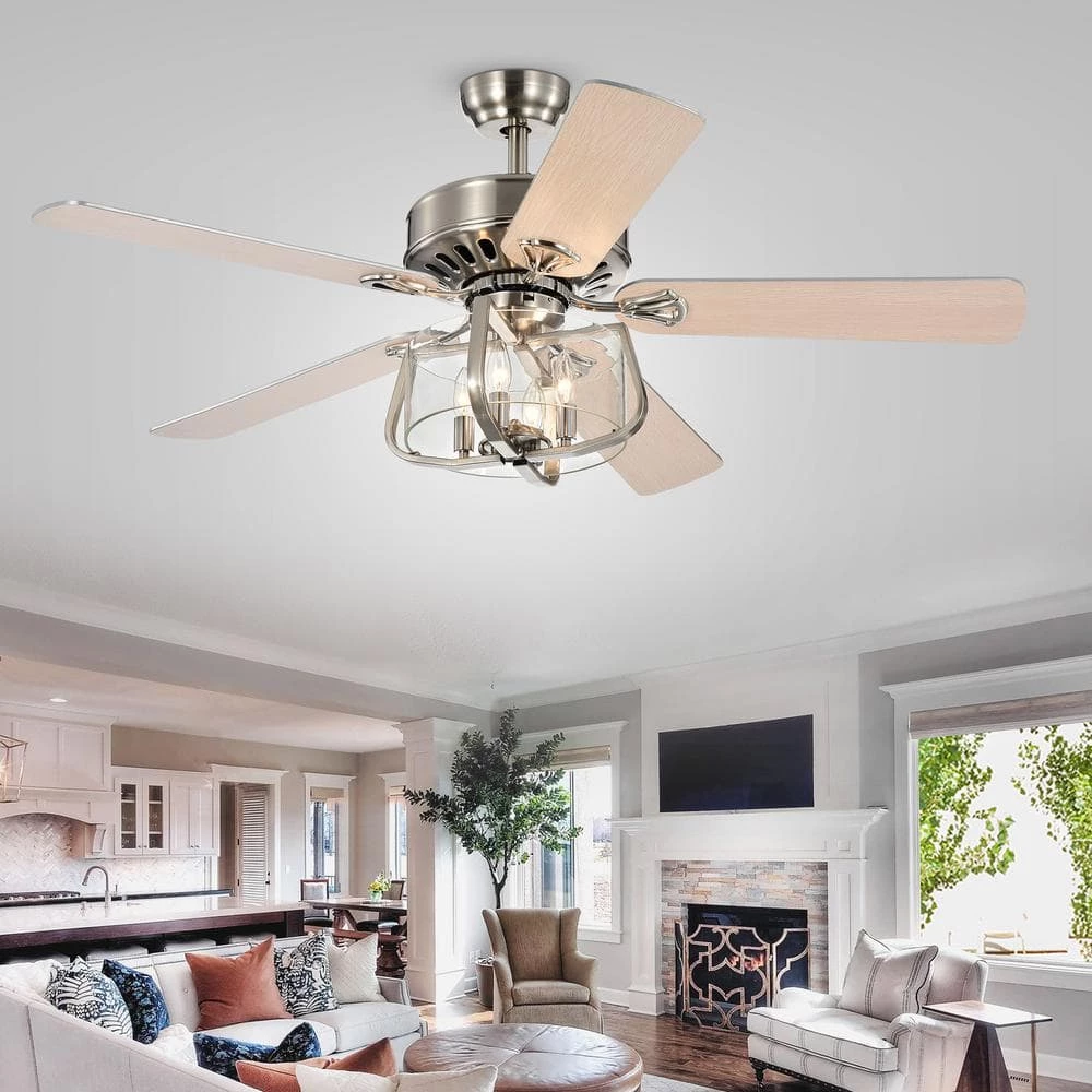 Light up any room and create a cooling comfort to your home with this lighted ceiling fan. The 4 candelabra light bulbs enclosed in a clear glass shade brings vibrant lighting and the 5 reversible wooden blades provide a cool breeze around your home. Remote Controlled for optimal convenience.