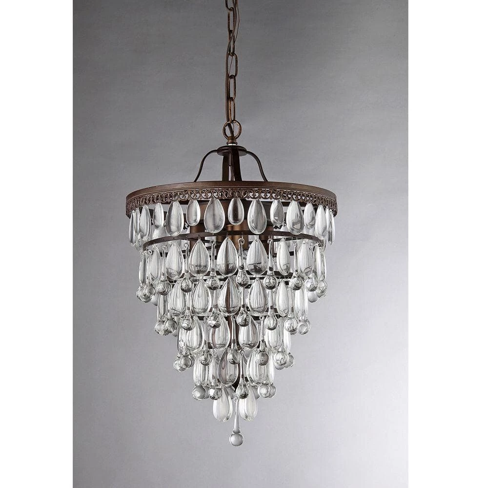With an elegant antiqued-bronze finish and stunning rows of crystals placed in the shape of an inverted pyramid, this Martinee Crystal Inverted Pyramid 4-Light Antique Bronze Chandelier shows your taste for elegance and refinement. 4-lights brighten up any indoor space. Install this dramatic chandelier in your entryway to create a sophisticated look while giving your family sufficient light as they return from evening activities. Use it to update your formal dining room or living space, and incorporate the refined bronze finish and inverted pyramid crystal configuration into a traditional or transitional decorative theme.