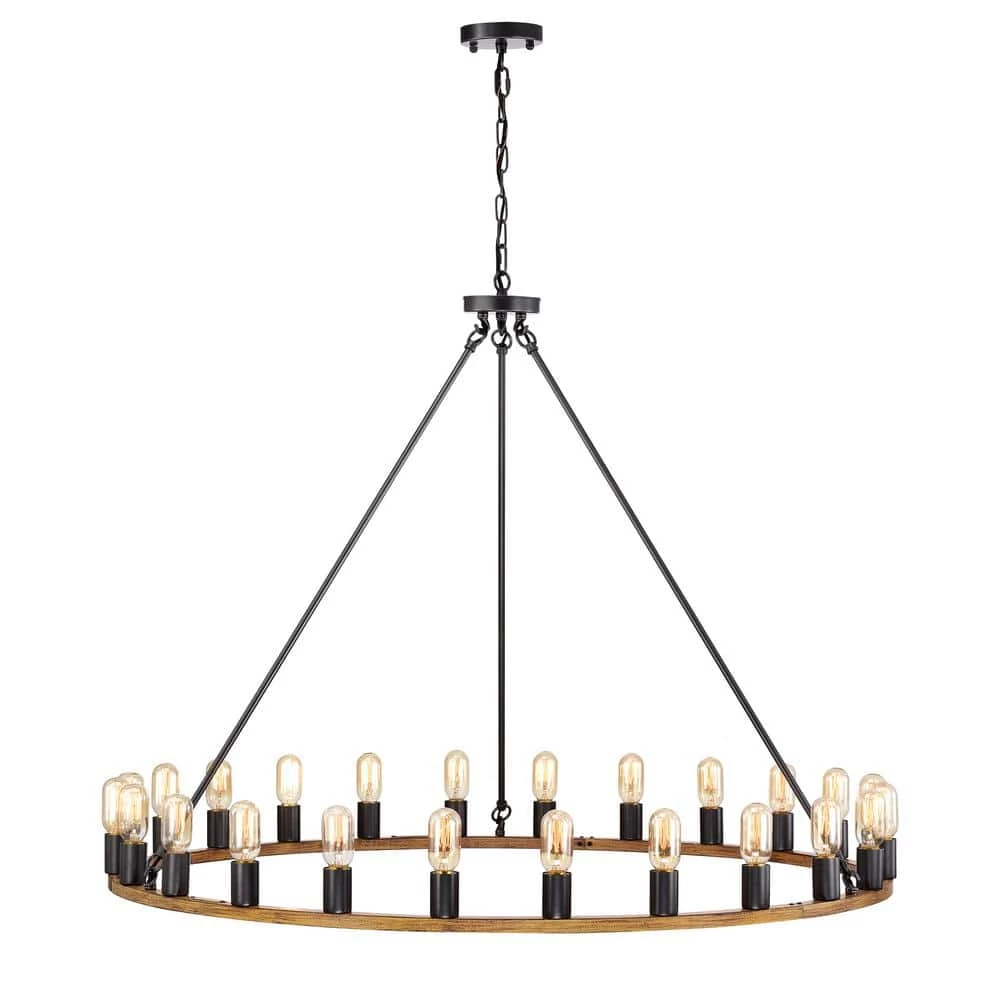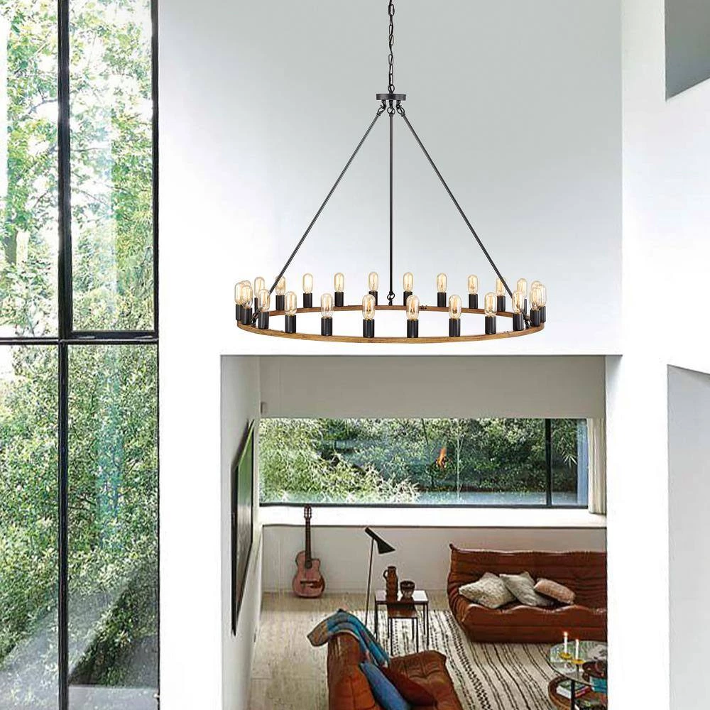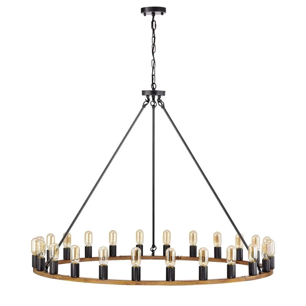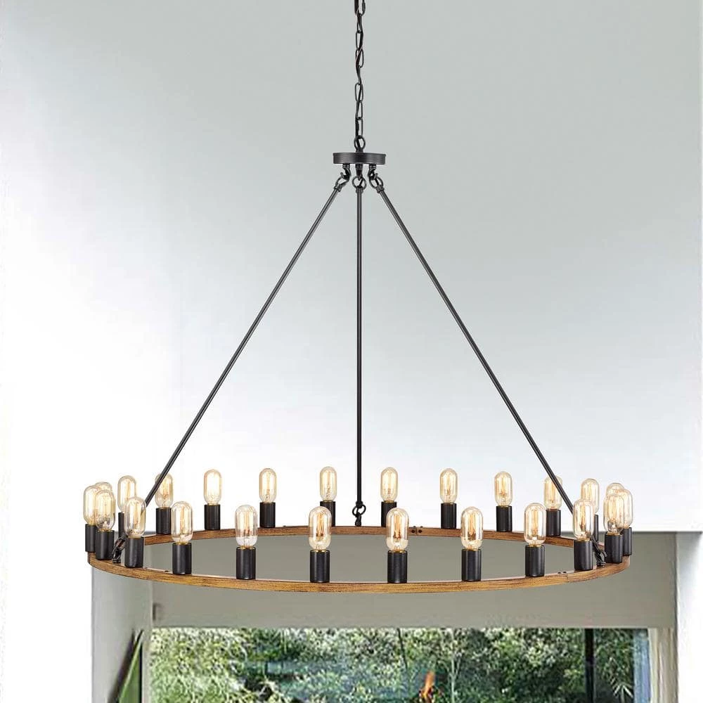 Striking in design and captivating in brilliance, this round wagon wheel chandelier is an illuminating and impressive addition to decor. The wood grain design holds 24-bulbs for warm and welcoming light perfect for showcasing farmhouse design sensibilities.