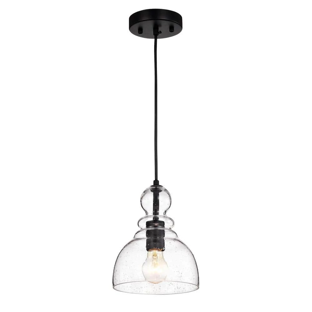 This is a minimalist style single light pendant lamp. Black socket housing and hardware. Long adjustable black ceiling cable wire. And a beautiful clear seeded glass shade in a decanter form. Its design has a broad appeal and will nicely match any decor from traditional to contemporary.