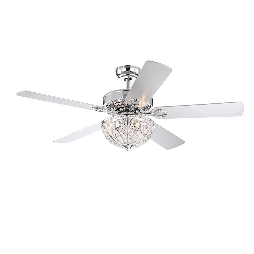 Add a dazzling look to your decor with this Novarro Lighted Ceiling Fan. It features a bowl-shaped crystal shade that provides multi-directional lighting. The 5 reversible color wooden blades create great air flow with a 3-speed reversible motor that insures you find just the right comfort level. The remote control functionality offers additional convenience.
