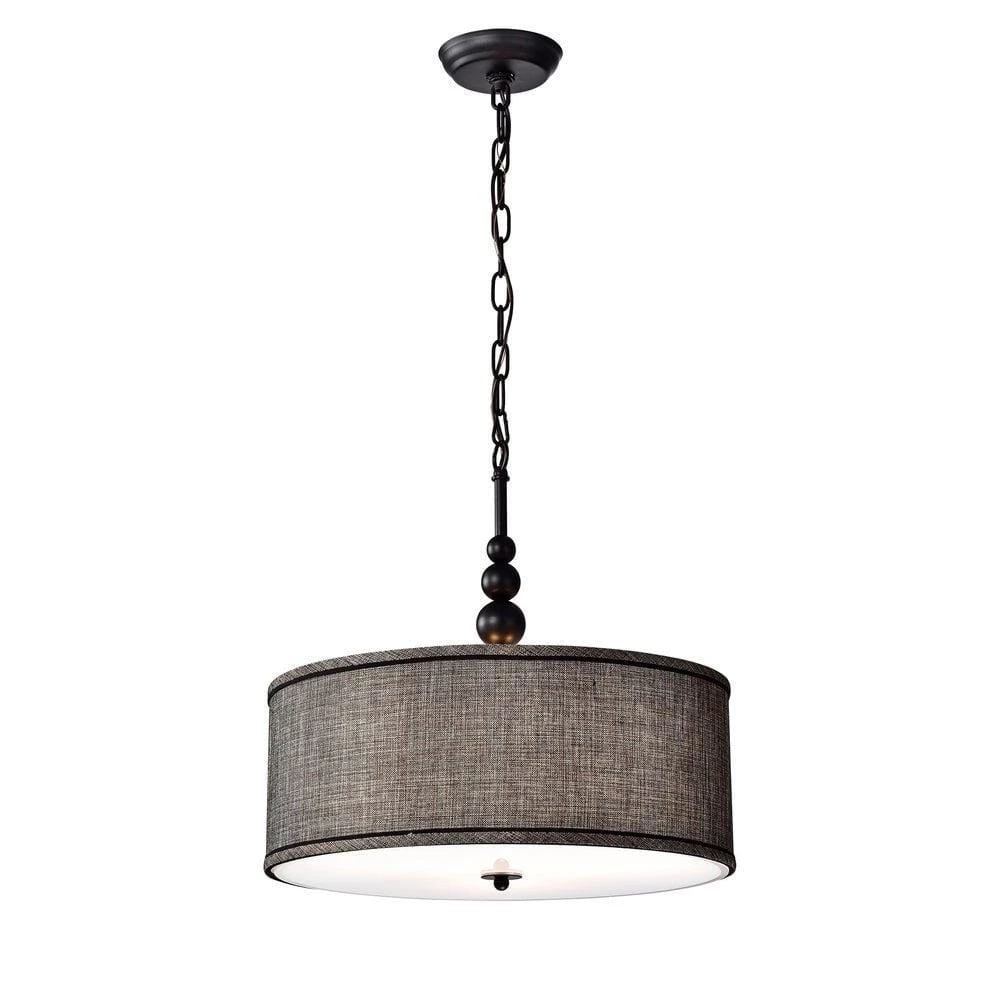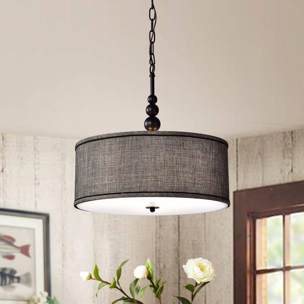 A smart and contemporary pendant lamp. It has a stylish black/white medium weave linen shade with black accent trimming. A frosted glass panel softens the lights from the bottom vent. Stacked iron spheres in antique black top the fixture for an elegant look.